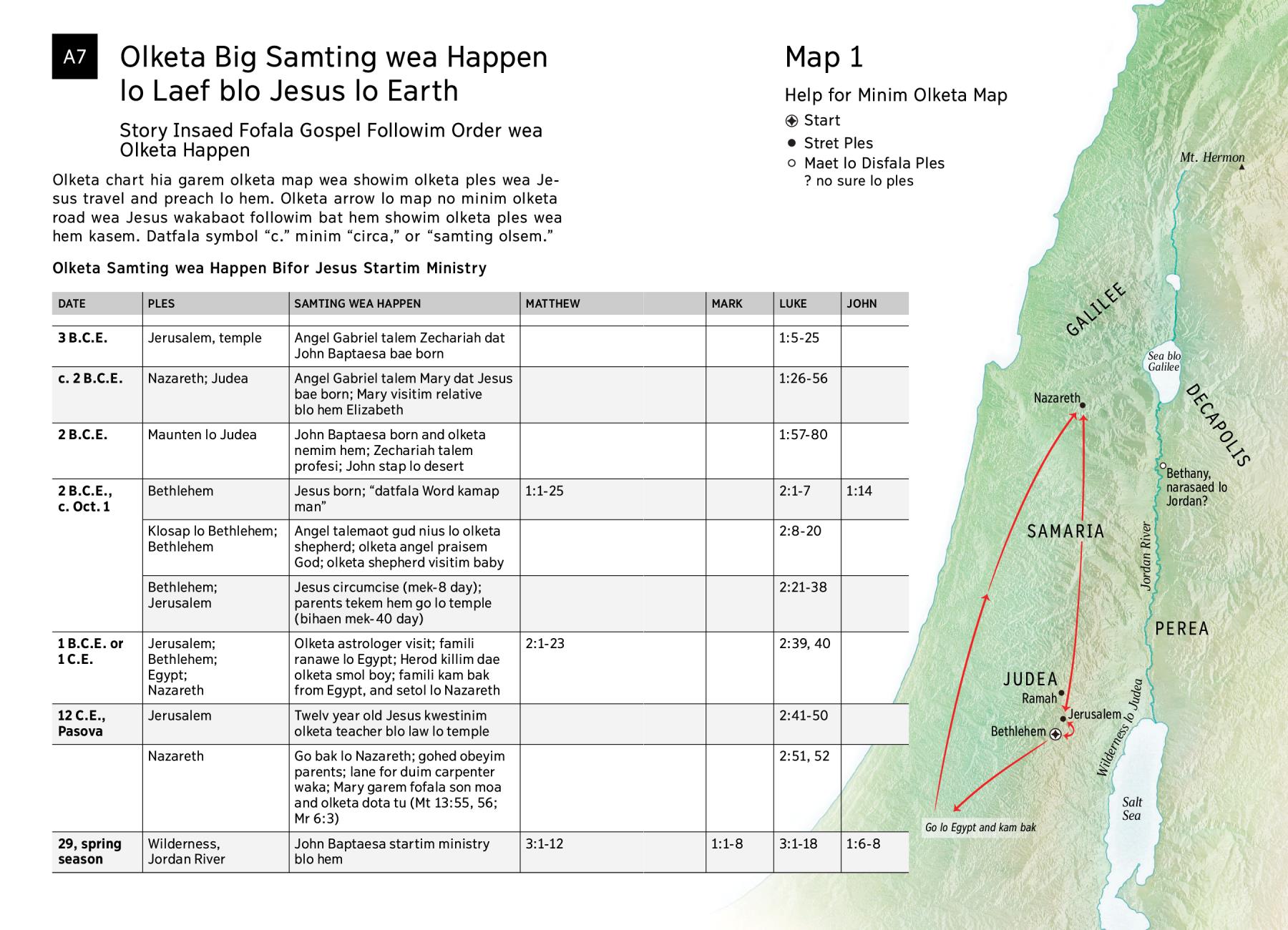 Olketa chart hia garem olketa map wea showim olketa ples wea Jesus travel and preach lo hem. Olketa arrow lo map no minim olketa road wea Jesus wakabaot followim bat hem showim olketa ples wea hem kasem. Datfala symbol “c.” minim “circa,” or “samting olsem.”
