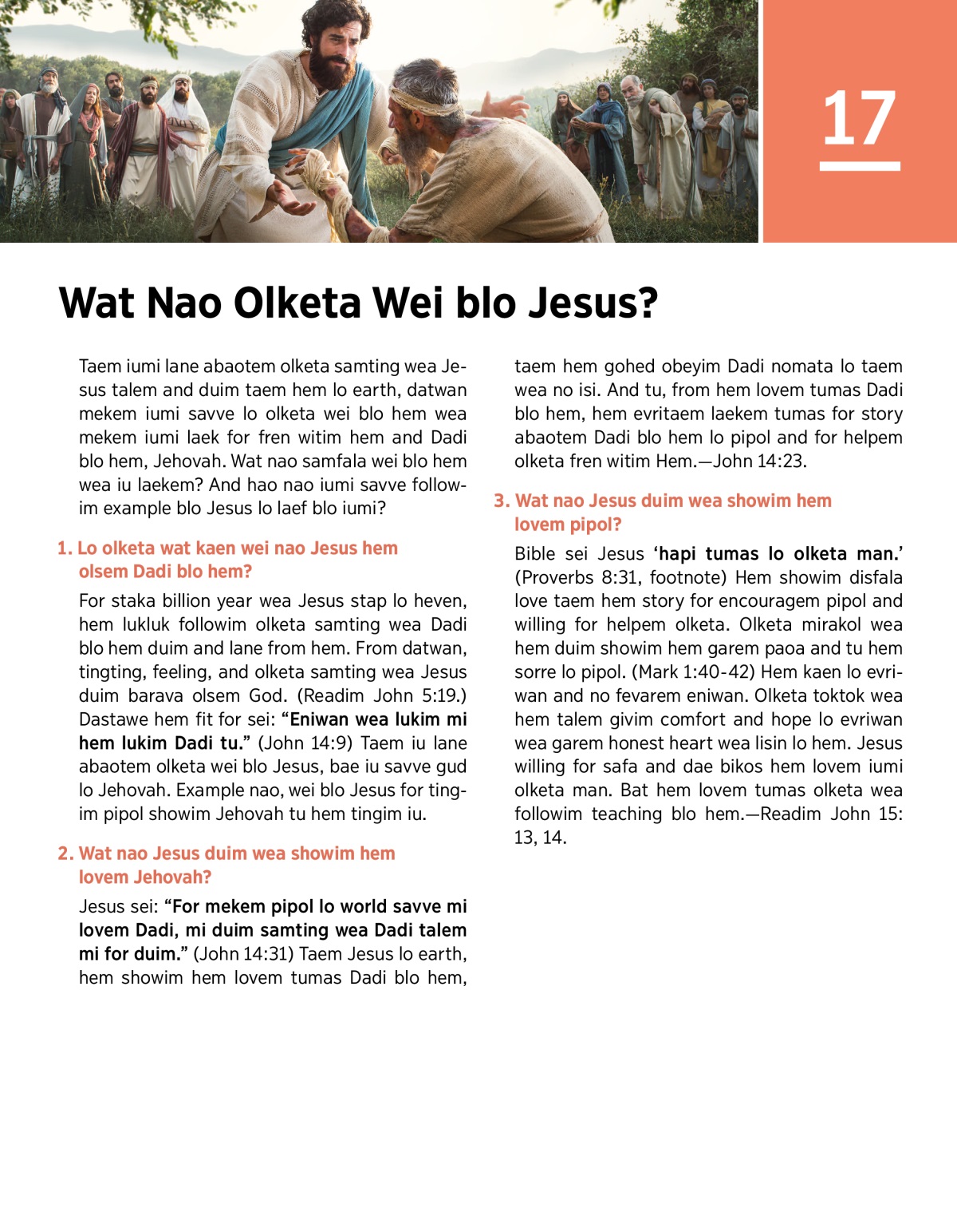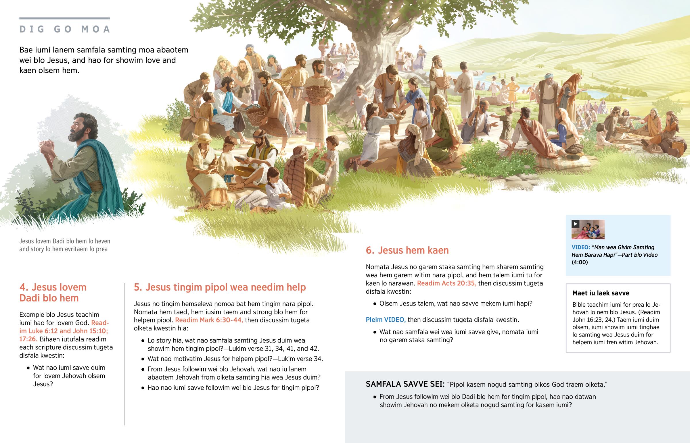 Jesus lovem Jehovah and olketa pipol tu. From Jesus followim wei blo Dadi blo hem, taem iu gohed lane abaotem hem bae iu savve gud lo Jehovah.