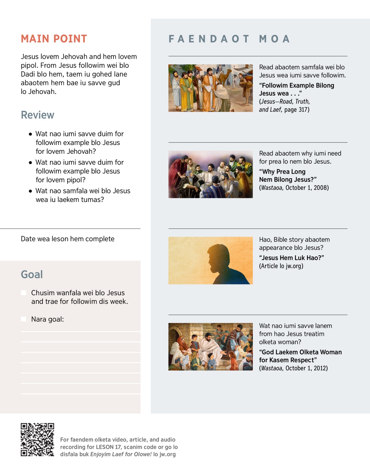 Taem iumi lane abaotem olketa samting wea Jesus talem and duim taem hem stap lo earth, iumi savve lo olketa wei blo hem wea mekem iumi laek for fren witim hem and Dadi blo hem, Jehovah. Wat nao samfala wei blo hem? And hao nao iumi savve followim olketa wei blo Jesus?