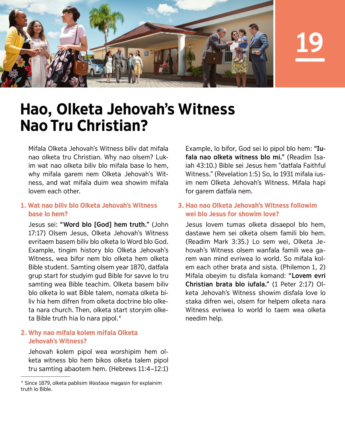 Olketa Jehovah’s Witness nao olketa tru Christian. Mifala olsem wan famili evriwea lo world. Olketa biliv blo mifala kam from Bible and mifala talemaot tru samting abaotem Jehovah.