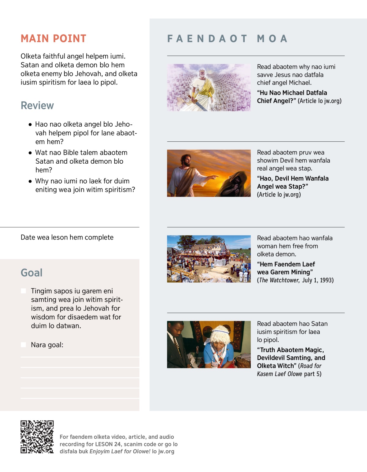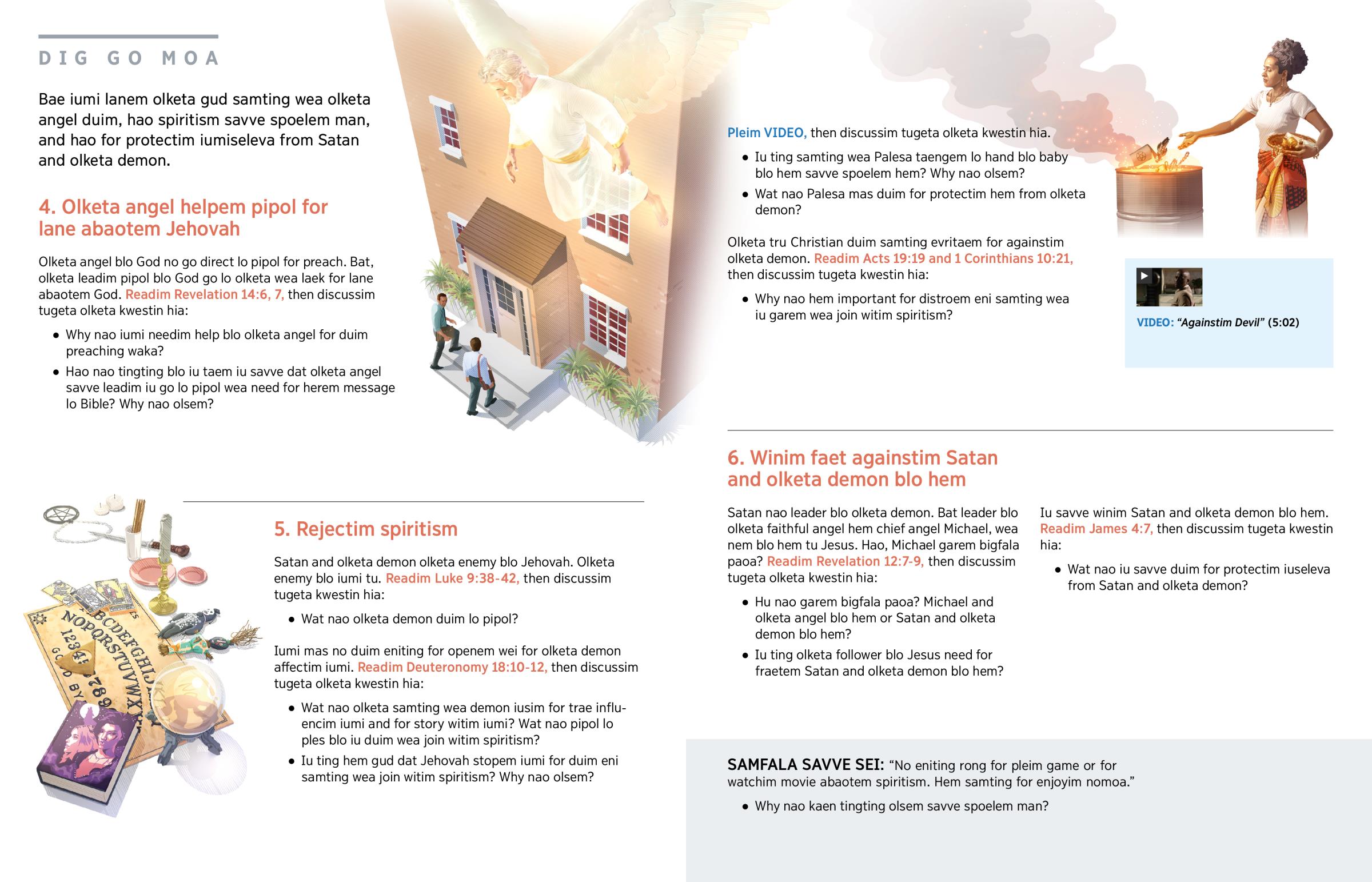 Bae iumi lanem olketa gud samting wea olketa angel duim, hao spiritism savve spoelem man, and hao for protectim iumiseleva from Satan and olketa demon.