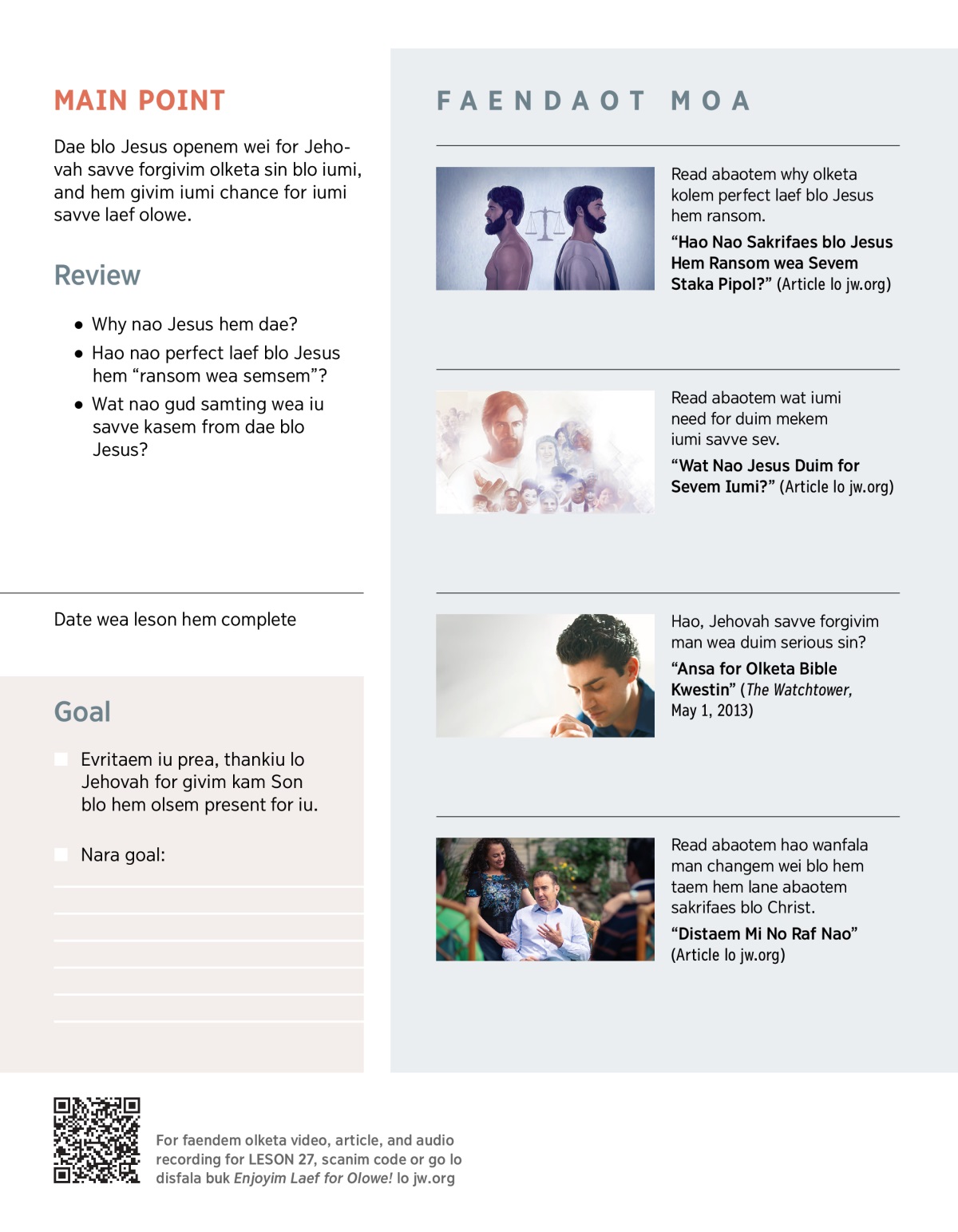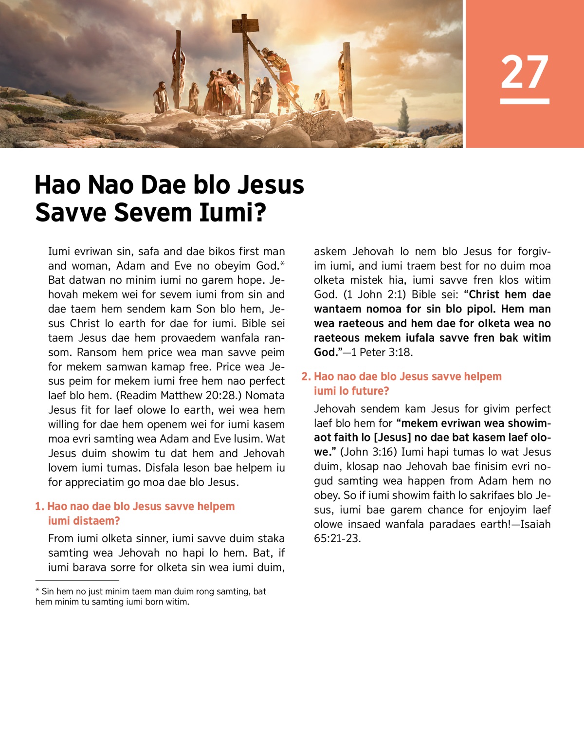 Iumi evriwan sin, kasem olketa nogud samting, and dae bikos first man and woman, Adam and Eve no obeyim God.a Bat datwan no minim iumi no garem hope nao. Jehovah mekem wei for sevem iumi from sin and dae. Hem sendem kam Son blo hem, Jesus Christ, lo earth for dae for iumi. Bible sei taem Jesus dae hem peim wanfala ransom. Ransom hem wanfala price wea man savve peim for mekem samwan kamap free. Price wea Jesus peim for mekem iumi free hem nao perfect laef blo hem. (Readim Matthew 20:28.) Jesus fit for laef olowe lo earth, bat hem willing for dae for mekem wei for iumi kasem moa evri samting wea Adam and Eve lusim. Jesus showim iumi tu hao hem and Jehovah lovem iumi tumas. Disfala leson bae helpem iu for tinghae lo dae blo Jesus.