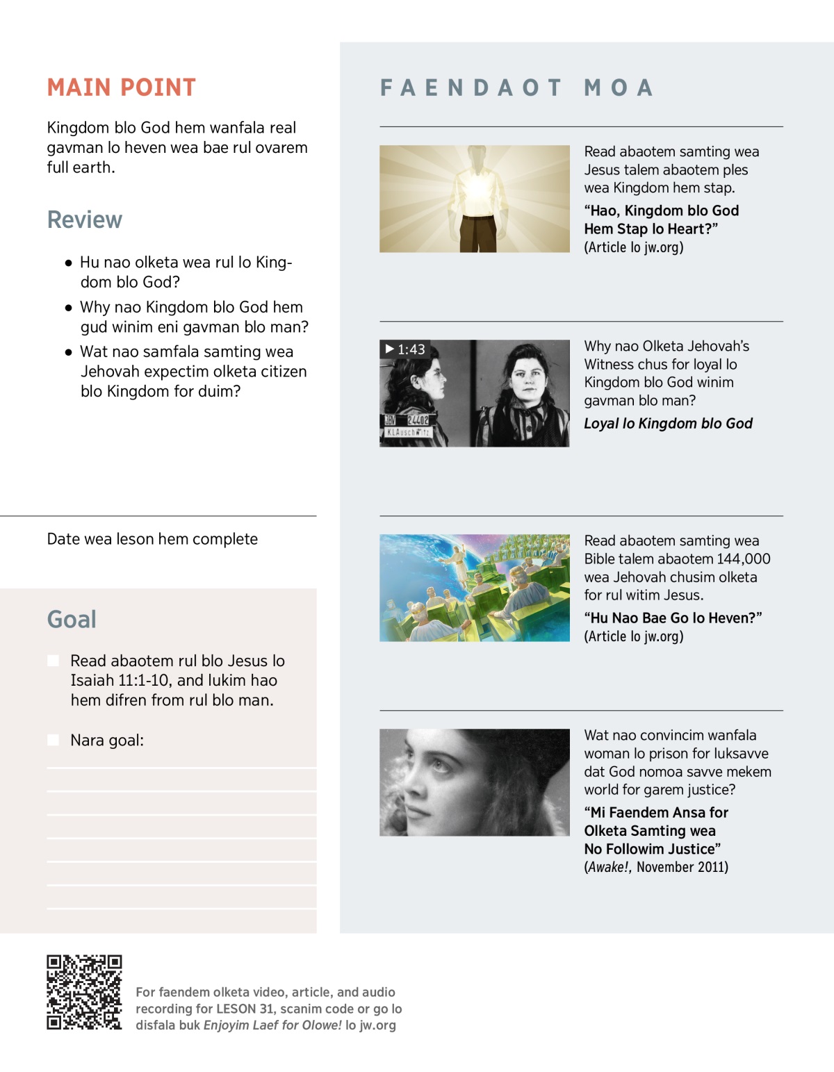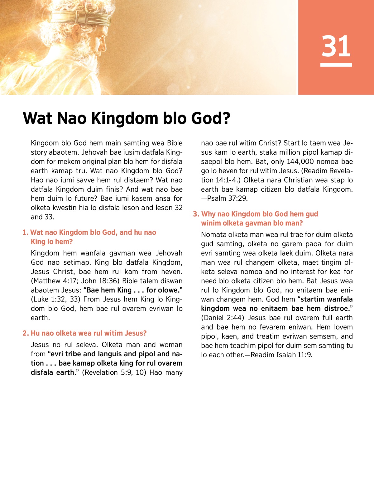Kingdom blo God hem main samting wea Bible storyim. Jehovah bae iusim datfala Kingdom for mekem plan blo hem for disfala earth kamap tru. Wat nao Kingdom blo God? Hao nao iumi savve hem rul distaem? Wat nao datfala Kingdom duim finis? And wat nao bae hem duim lo future? Bae iumi kasem ansa for olketa kwestin hia lo disfala leson and leson 32 and 33.