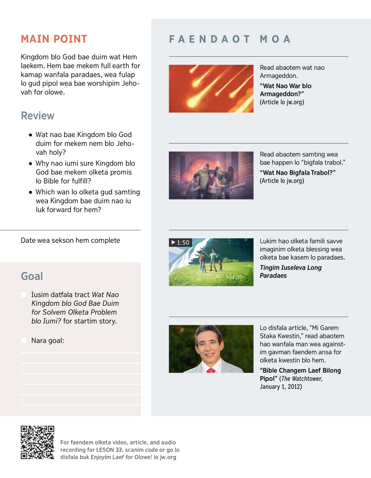 Kingdom bae mekem iumi garem gudfala laef wea Jehovah laekem iumi for garem. Iumi bae laef olowe lo paradaes lo earth. Pleim VIDEO for lukim hao Jehovah iusim Son blo hem, Jesus, for mekem plan blo hem kamap tru.