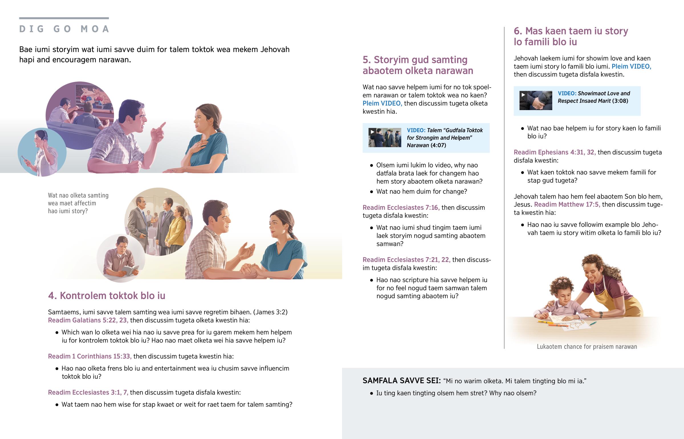 Wat nao savve helpem iumi for no talem toktok wea spoelem narawan? Pleim VIDEO, then discussim tugeta olketa kwestin hia.