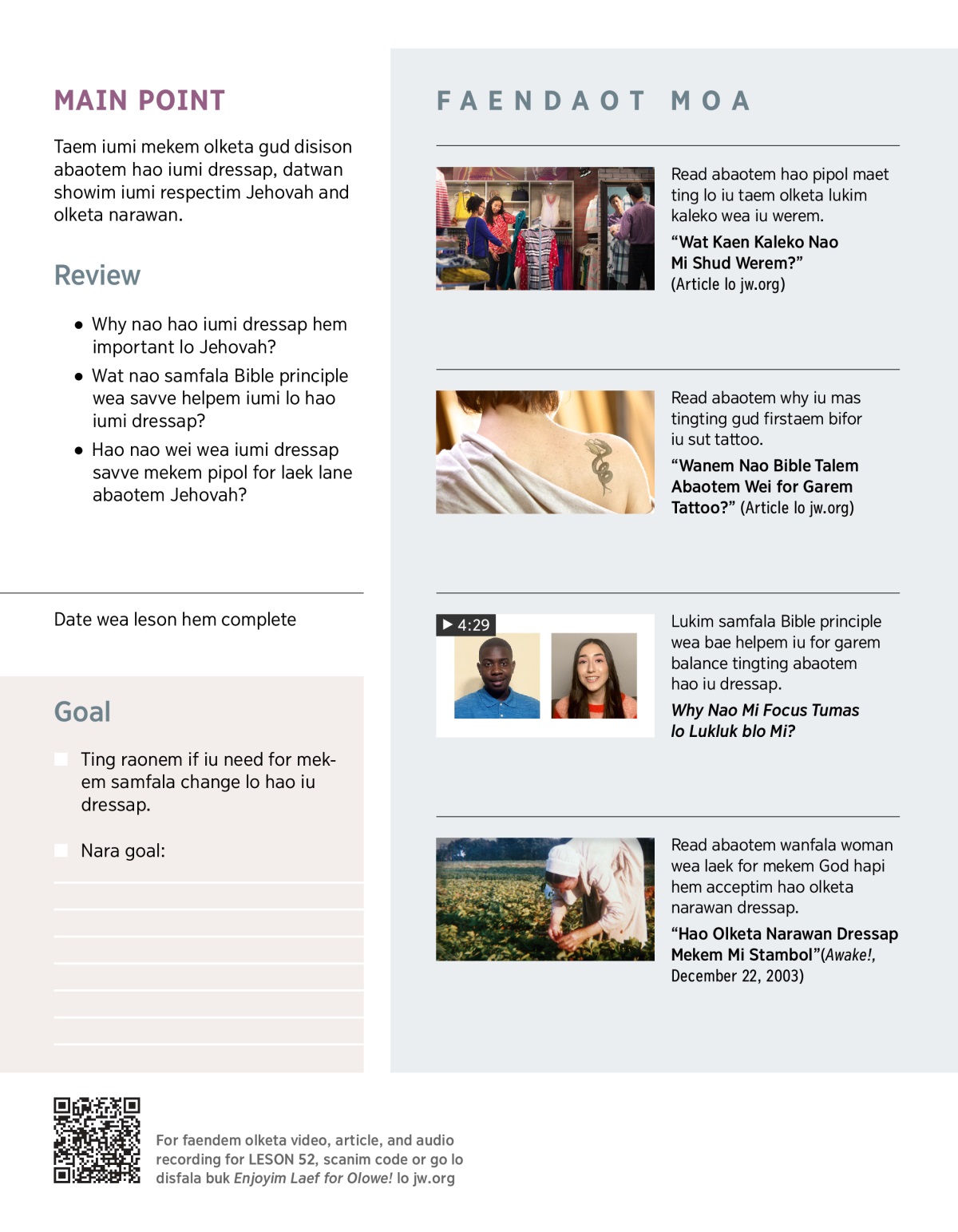 Iumi shud chusim “kaleko wea fitim and wea showimaot respect and gudfala tingting,” and evritaem luk klin for showim iumi “worshipim God.” (1 Timothy 2:9, 10) Tingim fofala principle hia: (1) Kaleko wea iumi werem shud “fitim” wanfala Christian. Lo olketa meeting, iu lukim hao pipol blo Jehovah garem olketa difren wei for dressap, bat evritaem kaleko and hairstyle blo olketa showim olketa respectim God. (2) Taem iumi werem kaleko wea showim “respect,” datwan bae mekem pipol for no garem rong tingting abaotem iumi or for lukluk strong lo iumi. (3) Iumi showim iumi garem “gudfala tingting” taem iumi no followim eni niu fashion distaem wea Jehovah no acceptim. (4) Dressap blo iumi shud evritaem showim iumi pipol wea “worshipim God.”—1 Corinth 10:31.
