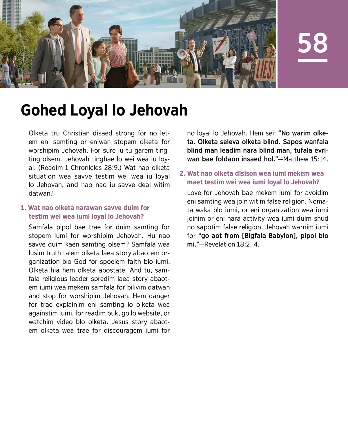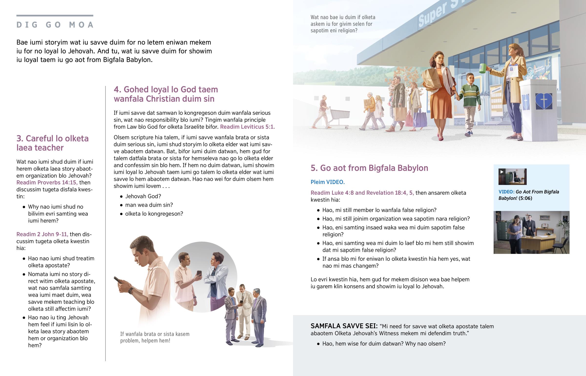 From iumi lovem Jehovah iumi bae no duim eni samting wea join witim false religion. Nomata for waka, joinim eni organization or duim eni nara samting wea sapotim false religion. Jehovah warnim iumi for “mas go aot from [Bigfala Babylon].”—Revelation 18:2, 4.