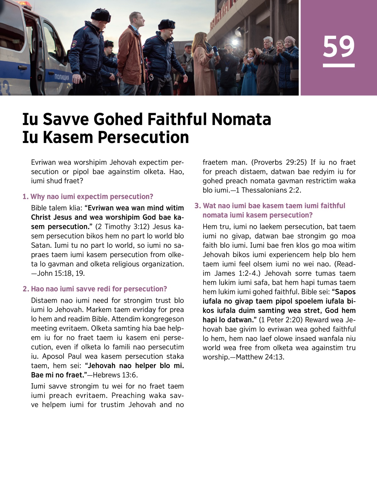 Bible sei: “Pipol bae spoelem tu eniwan wea laek for faithful long God and followim Christ Jesus.” (2 Timothy 3:12) Jesus kasem persecution bikos hem no olsem pipol lo world blo Satan. Iumi tu no olsem pipol lo world, so iumi no sapraes taem iumi kasem persecution from olketa gavman and religion.—John 15:18, 19.