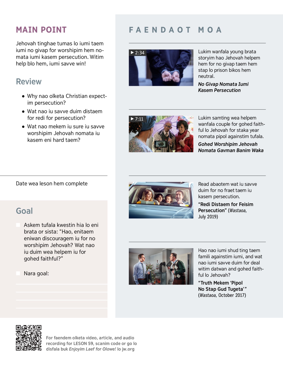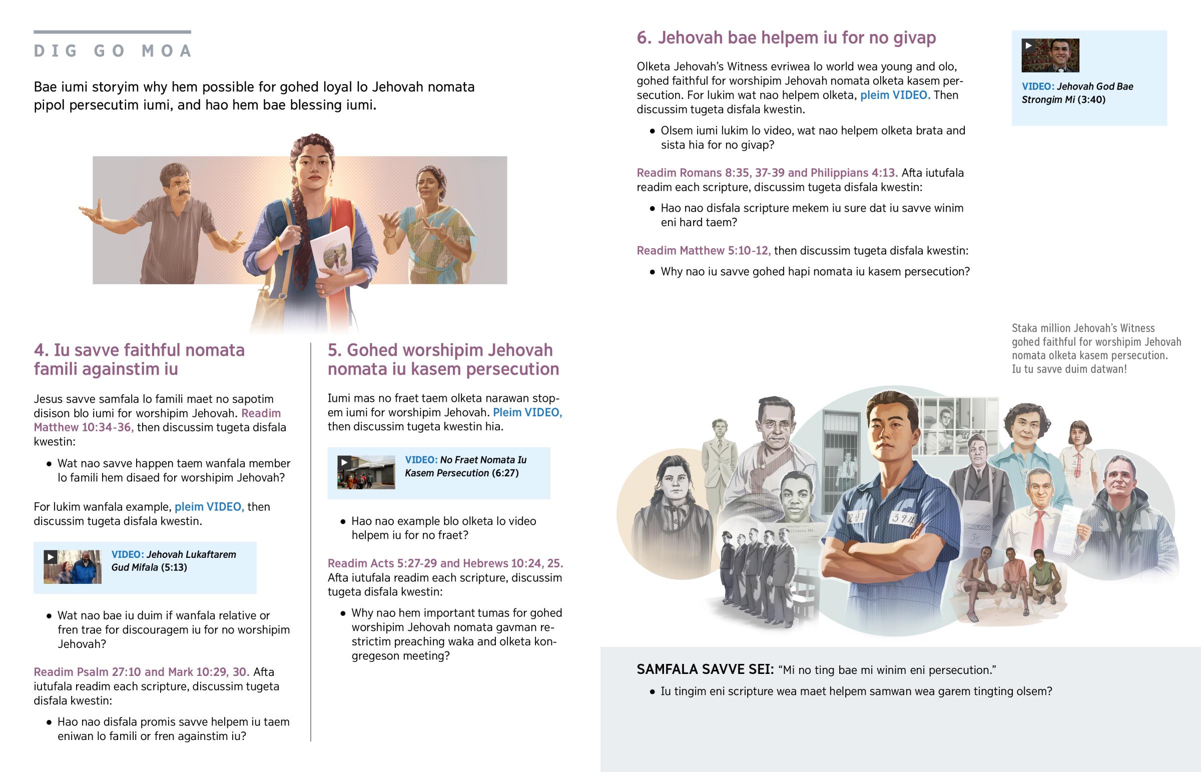 Olketa Jehovah’s Witness evriwea lo world wea young and olo, gohed faithful for worshipim Jehovah nomata olketa kasem persecution. For lukim wat nao helpem olketa, pleim VIDEO. Then discussim tugeta disfala kwestin.