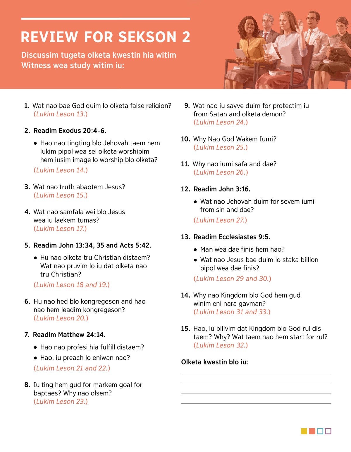 Discussim tugeta olketa kwestin hia witim Witness wea study witim iu: