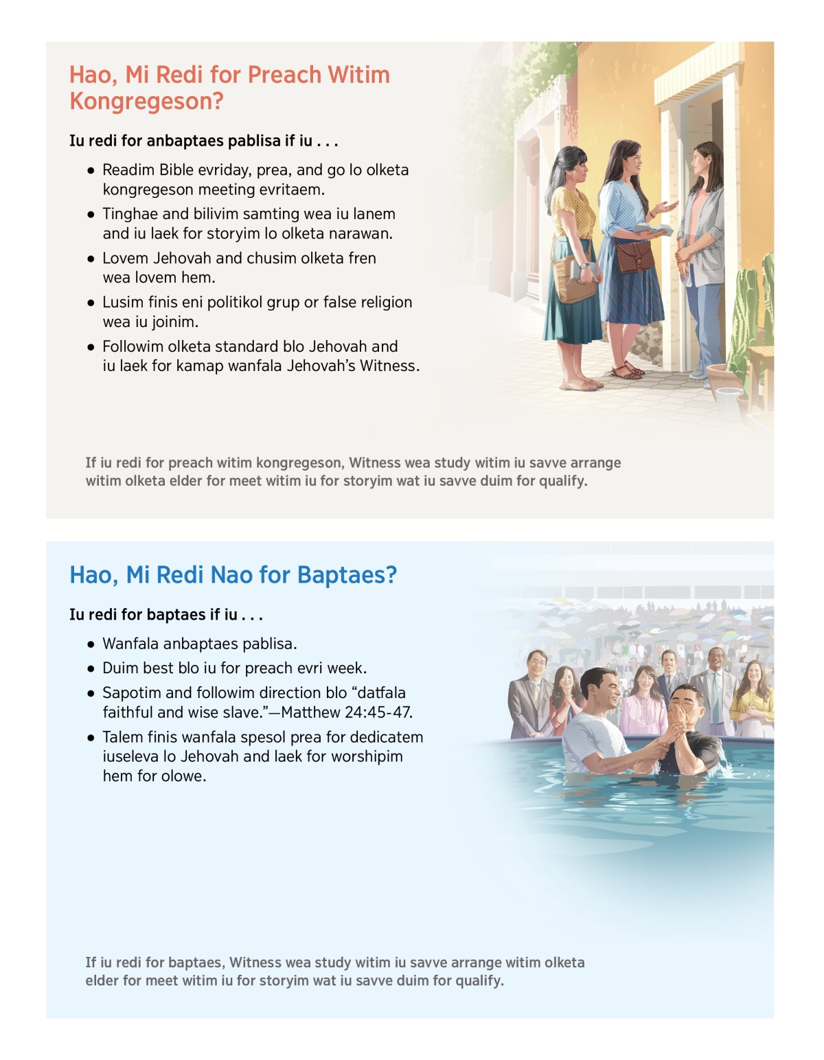 If iu redi for baptaes, Witness wea study witim iu savve arrange witim olketa elder for meet witim iu for storyim wat iu savve duim for qualify.