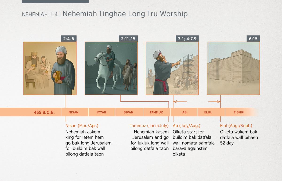 2:4-6 Nehemiah askem king for letem hem go bak long Jerusalem for buildim bak wall bilong datfala taon