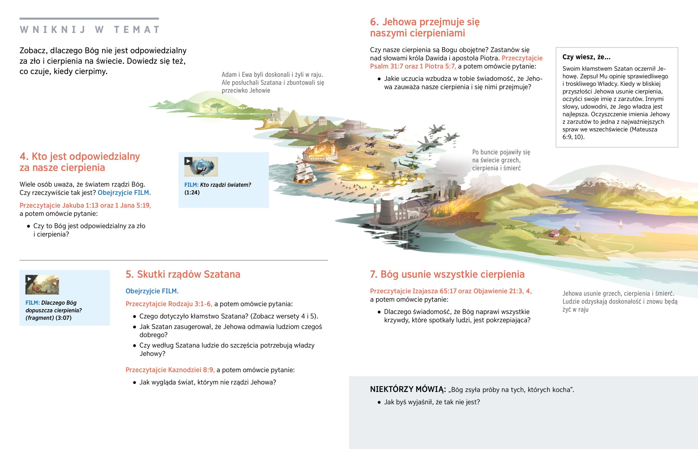 Odpowiedzialność za zło na świecie ponoszą przede wszystkim Szatan Diabeł i pierwsza para ludzka. Jehowa bardzo przejmuje się naszymi cierpieniami i wkrótce je usunie.