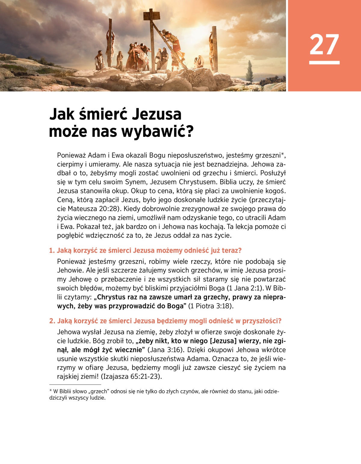 Ponieważ Adam i Ewa okazali Bogu nieposłuszeństwo, jesteśmy grzesznia, cierpimy i umieramy. Ale nasza sytuacja nie jest beznadziejna. Jehowa zadbał o to, żebyśmy mogli zostać uwolnieni od grzechu i śmierci. Posłużył się w tym celu swoim Synem, Jezusem Chrystusem. Biblia uczy, że śmierć Jezusa stanowiła okup. Okup to cena, którą się płaci za uwolnienie kogoś. Ceną, którą zapłacił Jezus, było jego doskonałe ludzkie życie (przeczytajcie Mateusza 20:28). Kiedy dobrowolnie zrezygnował ze swojego prawa do życia wiecznego na ziemi, umożliwił nam odzyskanie tego, co utracili Adam i Ewa. Pokazał też, jak bardzo on i Jehowa nas kochają. Ta lekcja pomoże ci pogłębić wdzięczność za to, że Jezus oddał za nas życie.
