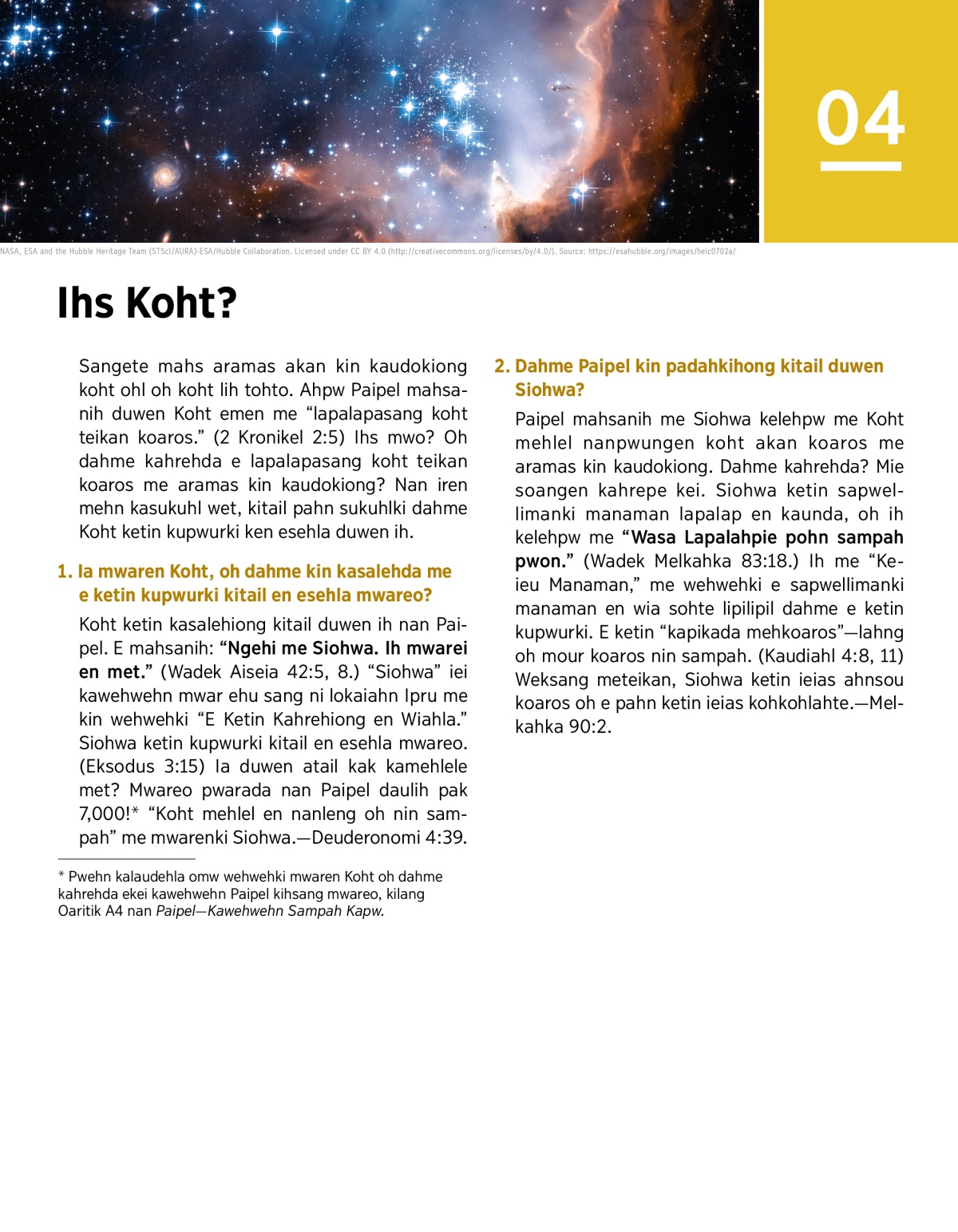 Koht ketin kasalehiong kitail duwen ih nan Paipel. E mahsanih: “Ngehi me Siohwa. Ih mwarei en met.” (Aiseia 42:5, 8, NW) “Siohwa” iei kawehwehn mwar ehu sang ni lokaiahn Ipru me kin wehwehki “E Ketin Kahrehiong en Wiahla.” Siohwa ketin kupwurki kitail en esehla mwareo. (Eksodus 3:15) Ia duwen atail kak kamehlele met? Mwareo pwarada nan Paipel daulih pak 7,000!a “Koht en nanleng oh pil sampah” me mwarenki Siohwa.—Deuderonomi 4:39.