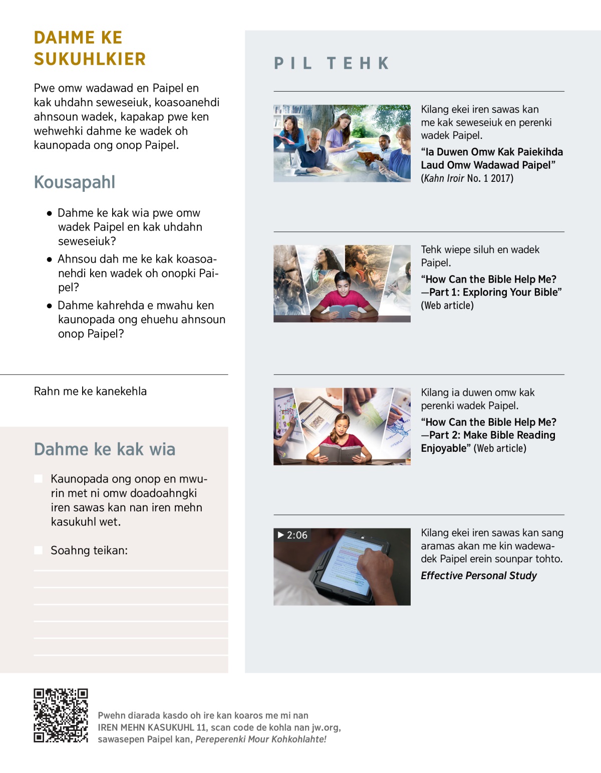 Mie pak ke men tapiada doadoahk laud ehu ahpw ke medewe me e nohn apwal? Mweinele ke pahn mengeikihla doadoahko ni omw ekisekis wia. Met pil duwehte wadawad Paipel. Mwein ke kin medewe, ‘Ia wasa I pahn tepida?’ Nan iren mehn kasukuhl wet kitail pahn koasoiapene soahng mengei kei me ke kak wia pwe ken kak wiahiong omw wadek oh onopki Paipel en kaperen.