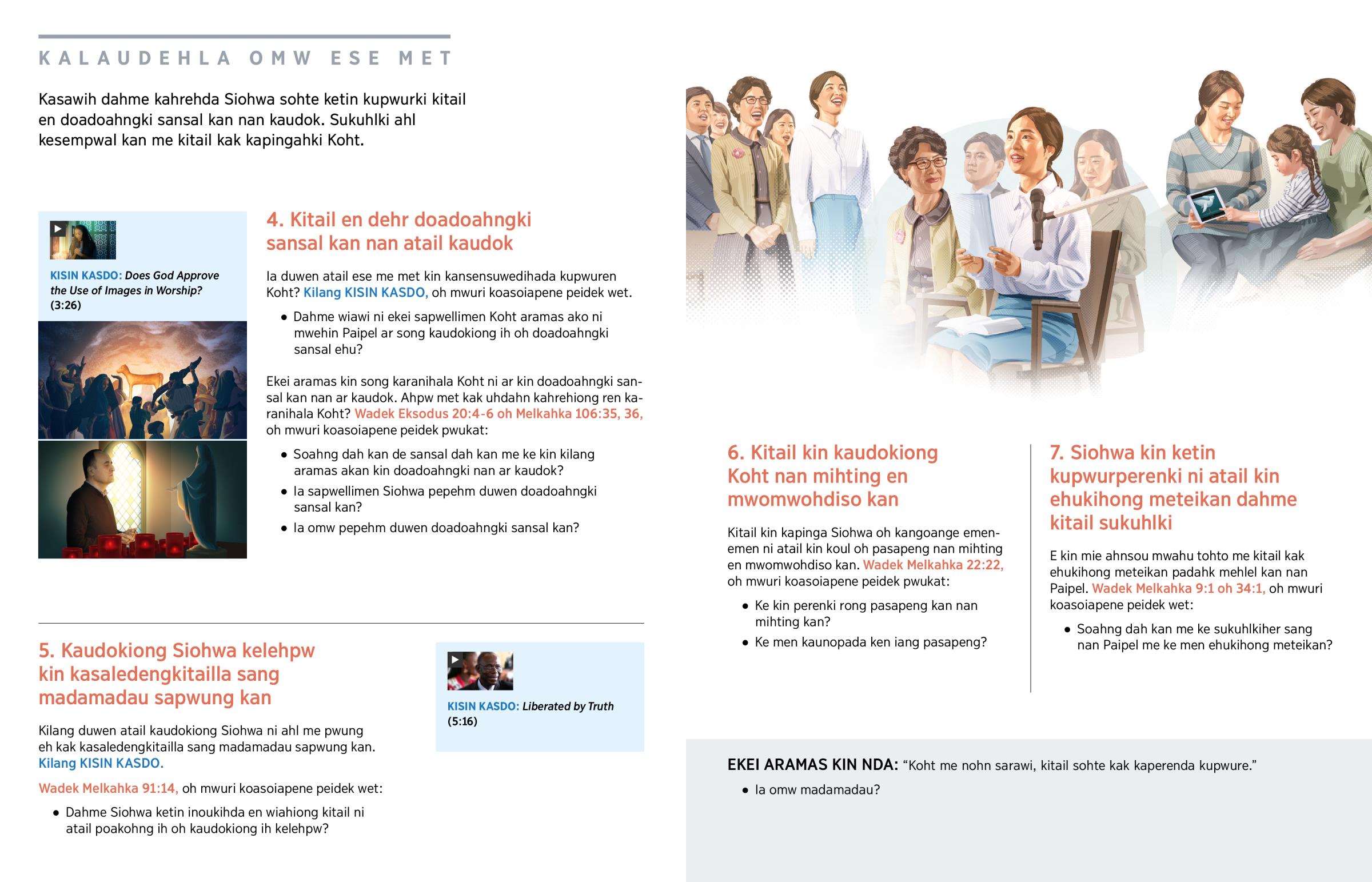 Ekei aramas kin song karanihala Koht ni ar kin doadoahngki sansal kan nan ar kaudok. Ahpw met kak uhdahn kahrehiong ren karanihala Koht? Wadek Eksodus 20:4-6 oh Melkahka 106:35, 36, oh mwuri koasoiapene peidek pwukat: