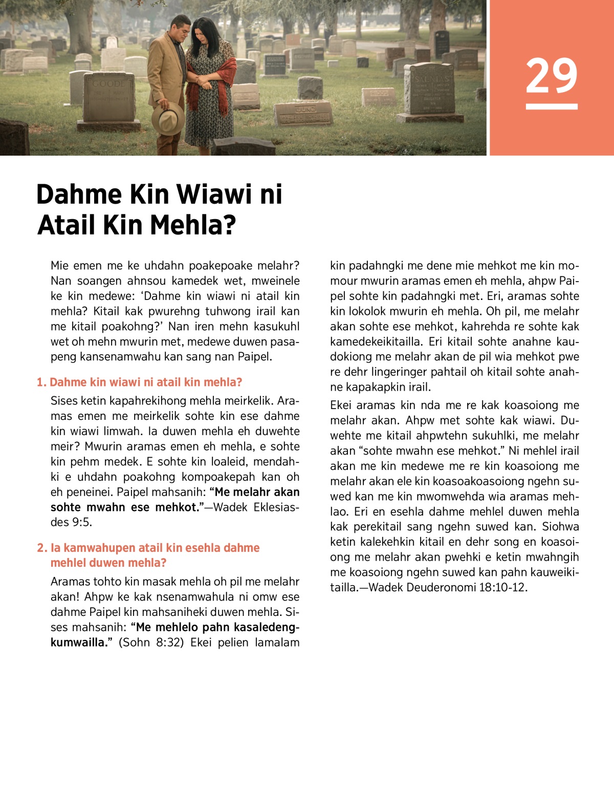 Ekei aramas kin nda me re kak koasoiong me melahr akan. Ahpw met sohte kak wiawi. Duwehte me kitail ahpwtehn sukuhlki, me melahr akan “sohte ese mehkot.” Ni mehlel irail akan me kin medewe me re kin koasoiong me melahr akan ele kin koasoakoasoiong ngehn suwed kan me kin mwomwehda wia aramas mehlao. Eri en esehla dahme mehlel duwen mehla kak perekitail sang ngehn suwed kan. Siohwa ketin kalekehkin kitail en dehr song en koasoiong me melahr akan pwehki e ketin mwahngih me koasoiong ngehn suwed kan pahn kauweikitailla.—Wadek Deuderonomi 18:10-12.