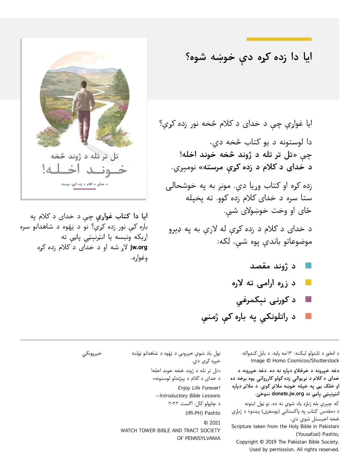ایا دا کتاب غواړې چې د خدای د کلام په باره کې نور زده کړې؟ نو د یَهّوه د شاهدانو سره اړیکه ونیسه یا انټرنېټي پاڼې ته jw.org لاړ شه او د خدای د کلام زده کړه وغواړه.