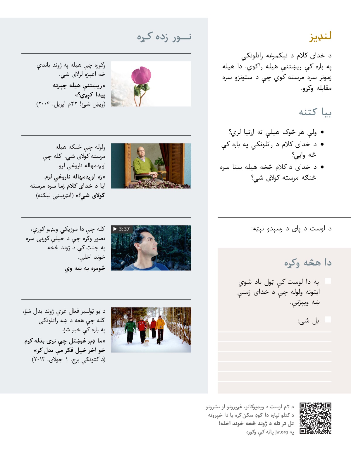 ډېر خلک چې شاوخوا ستونزې ویني، وارخطا او حتیٰ په قهر کېږي. ځینې هڅه کوي چې بد حالات سم کړي او ځینې د ښه نړۍ لپاره مبارزه کوي. د خدای د کلام ژمنې نن هم زمونږ سره مرسته کولای شي. ویډیو وګوره او لاندې پوښتنې څېړنه وکړه: