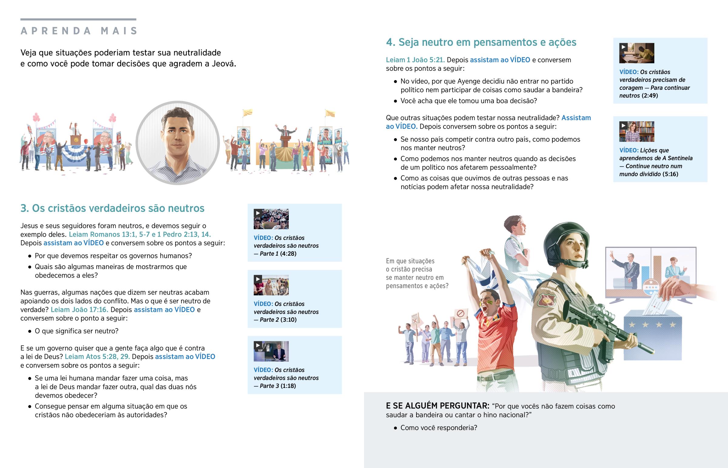 Jesus e seus seguidores foram neutros, e devemos seguir o exemplo deles. Leiam Romanos 13:1, 5-7 e 1 Pedro 2:13, 14. Depois assistam ao VÍDEO e conversem sobre os pontos a seguir: