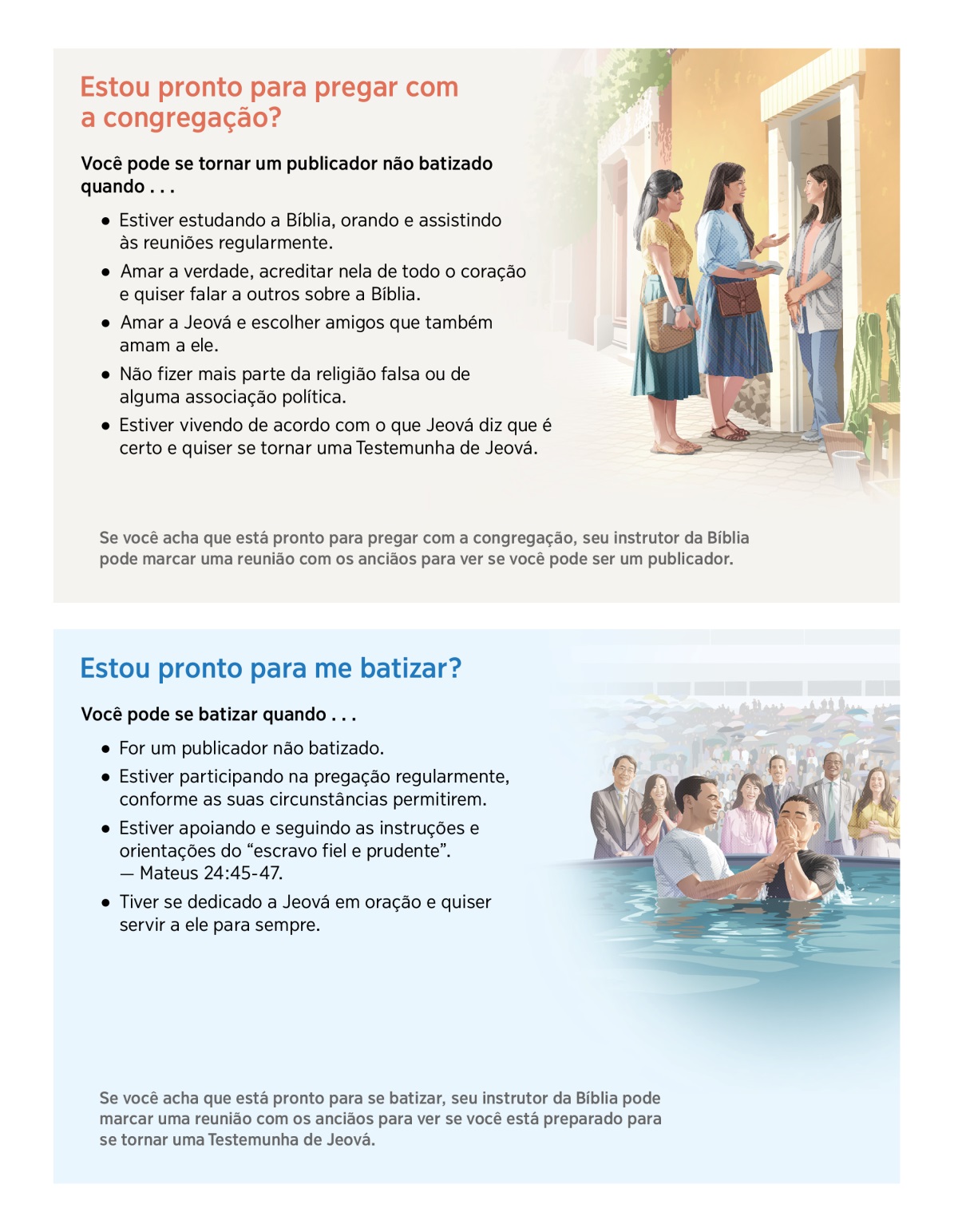 Se você acha que está pronto para se batizar, seu instrutor da Bíblia pode marcar uma reunião com os anciãos para ver se você está preparado para se tornar uma Testemunha de Jeová.