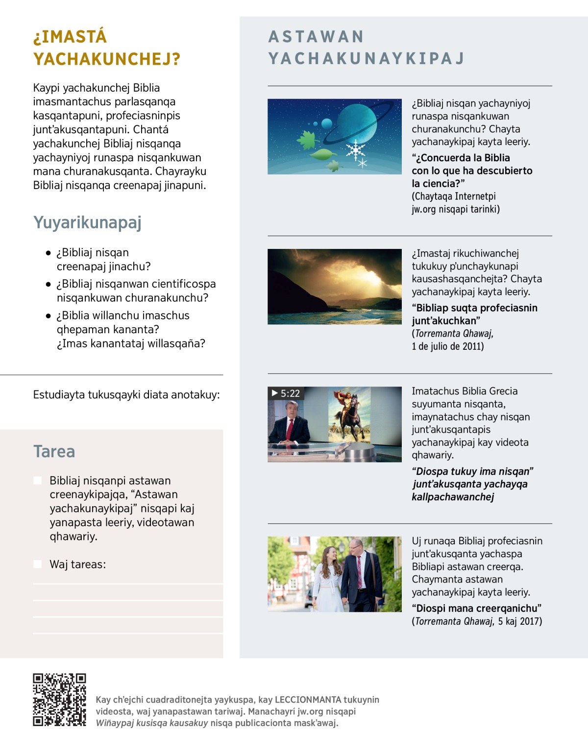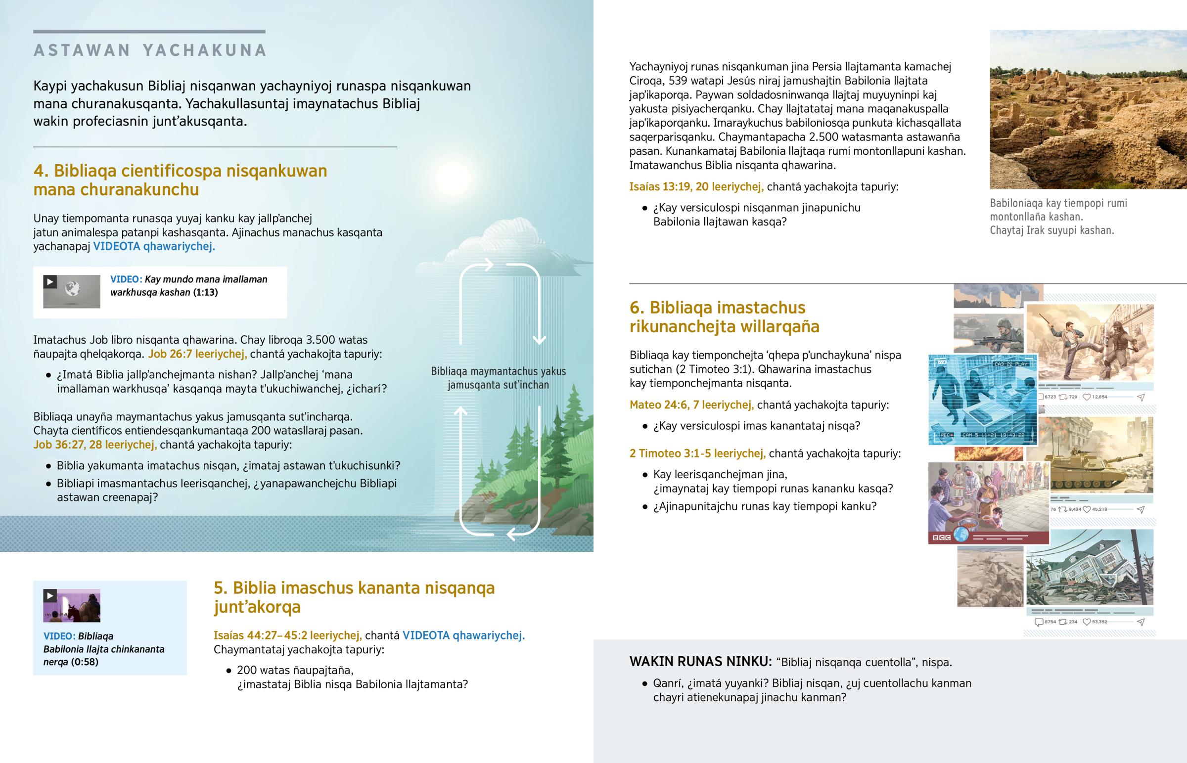 Kaypi yachakusun Bibliaj nisqanwan yachayniyoj runaspa nisqankuwan mana churanakusqanta. Yachakullasuntaj imaynatachus Bibliaj wakin profeciasnin juntʼakusqanta.