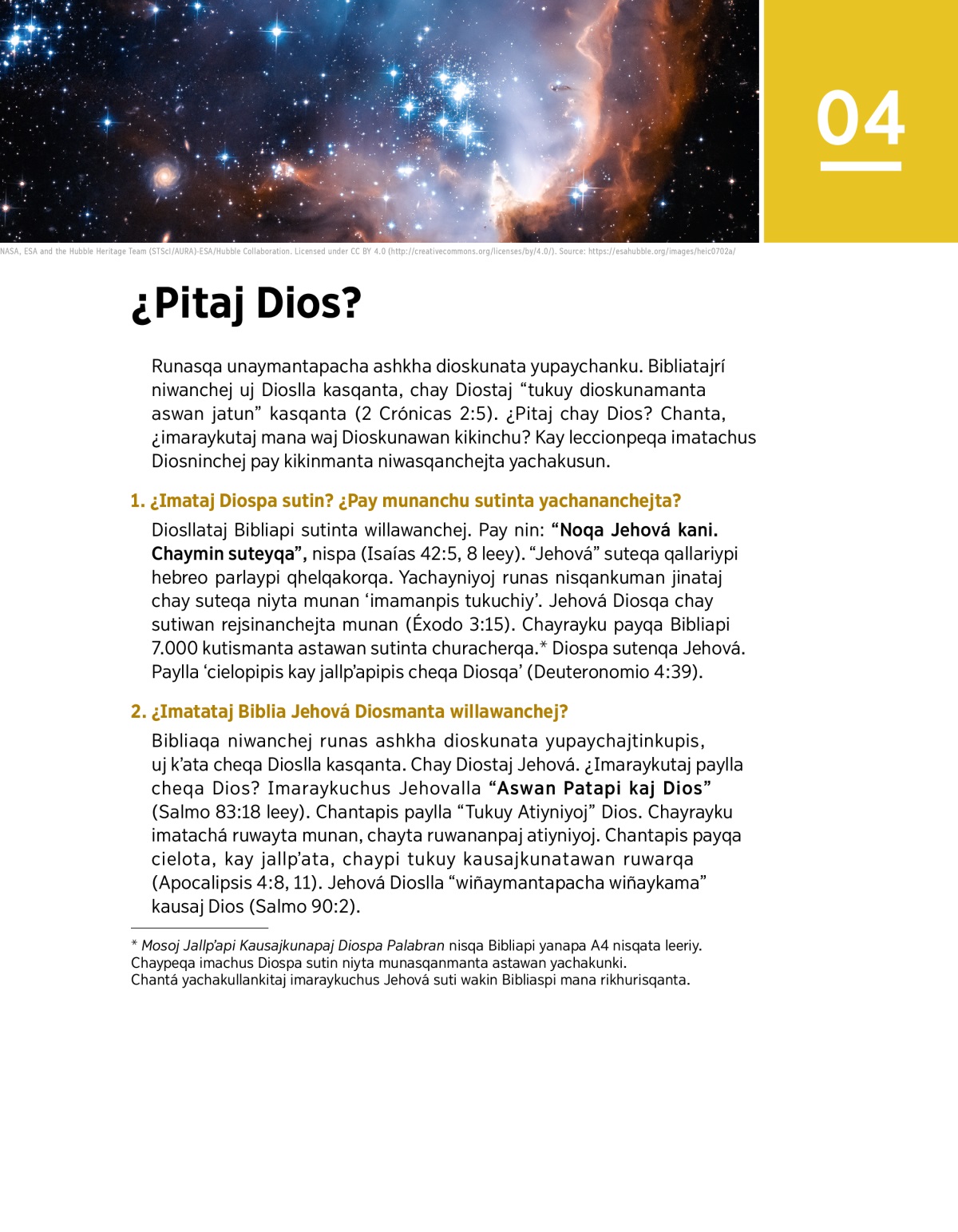Runasqa unaymantapacha ashkha dioskunata yupaychanku. Bibliatajrí niwanchej uj Dioslla kasqanta, chay Diostaj “tukuy dioskunamanta aswan jatun” kasqanta (2 Crónicas 2:5). ¿Pitaj chay Dios? Chanta, ¿imaraykutaj mana waj Dioskunawan kikinchu? Kay leccionpeqa imatachus Diosninchej pay kikinmanta niwasqanchejta yachakusun.