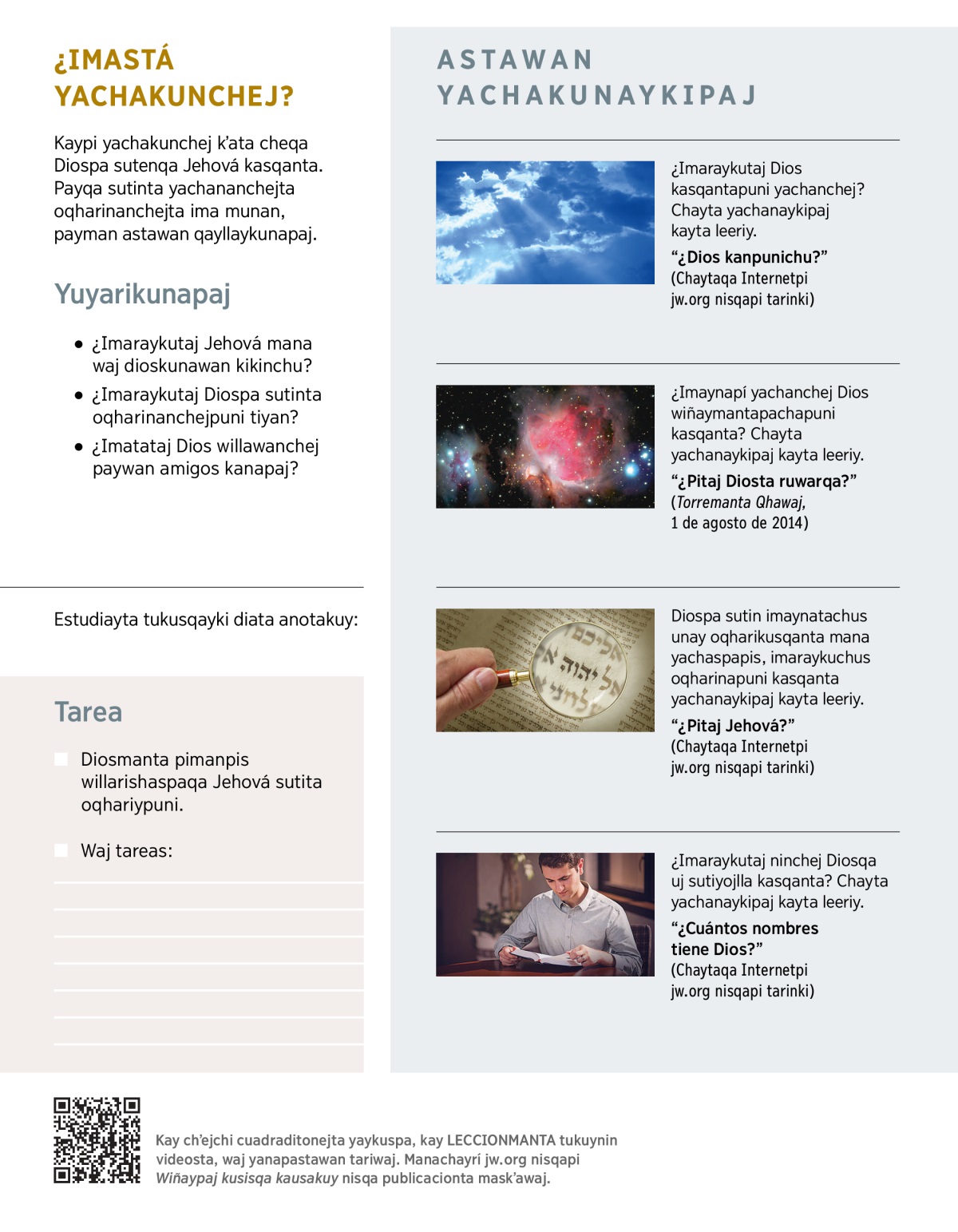 Jehová Diosqa sutinta yachananchejta munan. ¿Imaynatá chayta yachanchej? Chaypaj VIDEOTA qhawariychej, chantá yachakojta tapuriy: