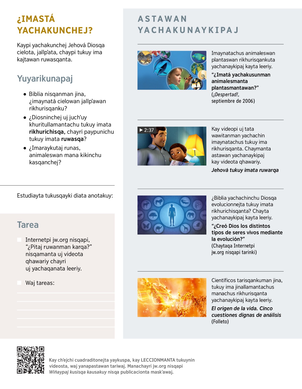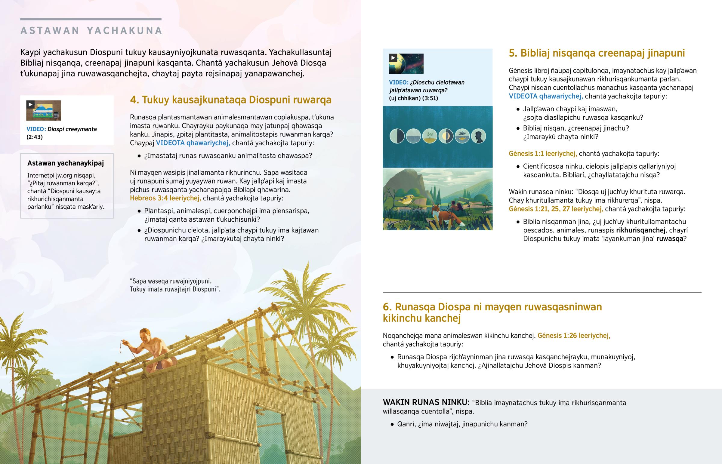 Kaypi yachakusun Diospuni tukuy kausayniyojkunata ruwasqanta. Yachakullasuntaj Bibliaj nisqanqa, creenapaj jinapuni kasqanta. Chantá yachakusun Jehová Diosqa tʼukunapaj jina ruwawasqanchejta, chaytaj payta rejsinapaj yanapawanchej.
