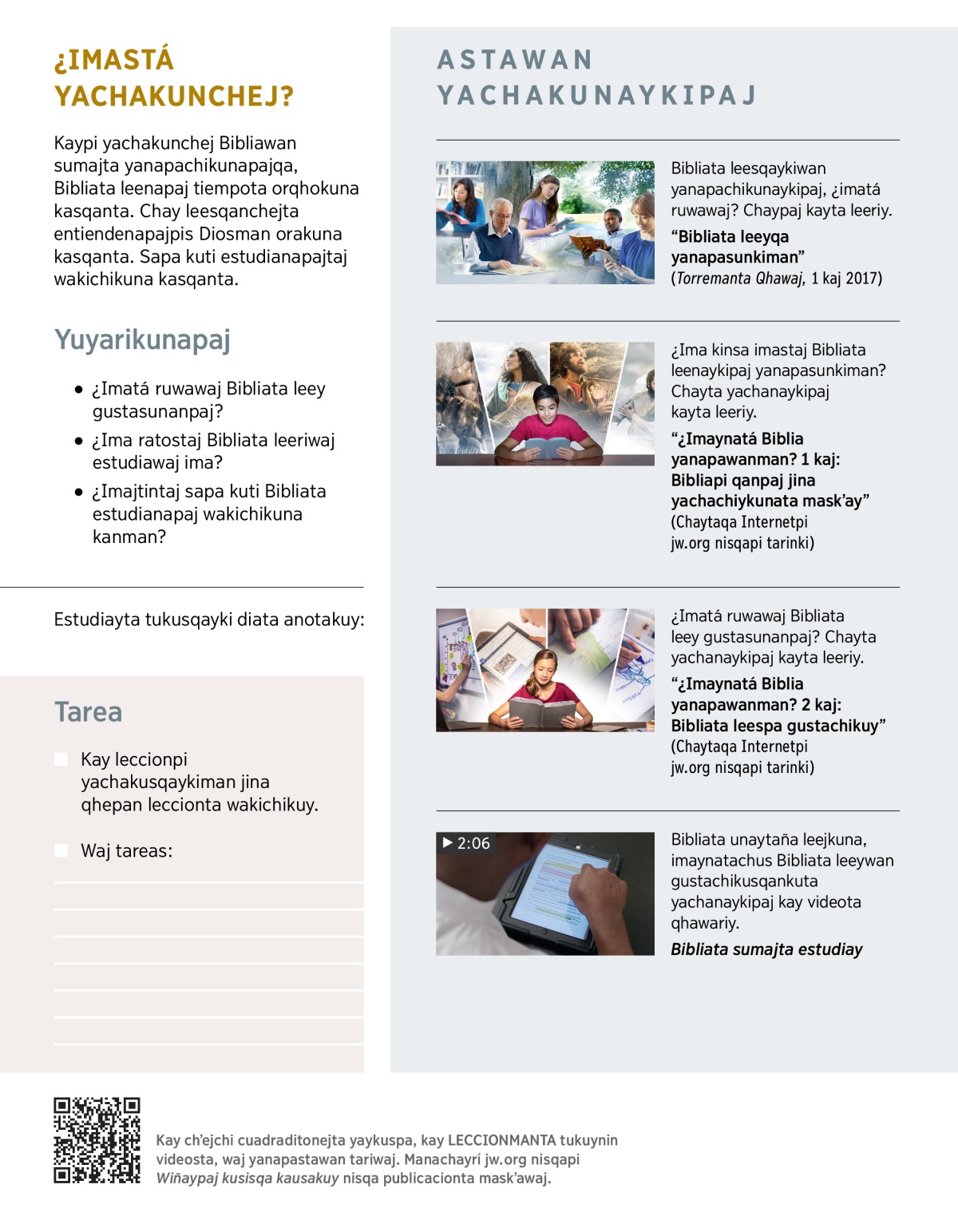 Kaypi yachakunchej Bibliawan sumajta yanapachikunapajqa, Bibliata leenapaj tiempota orqhokuna kasqanta. Chay leesqanchejta entiendenapajpis Diosman orakuna kasqanta. Sapa kuti estudianapajtaj wakichikuna kasqanta.