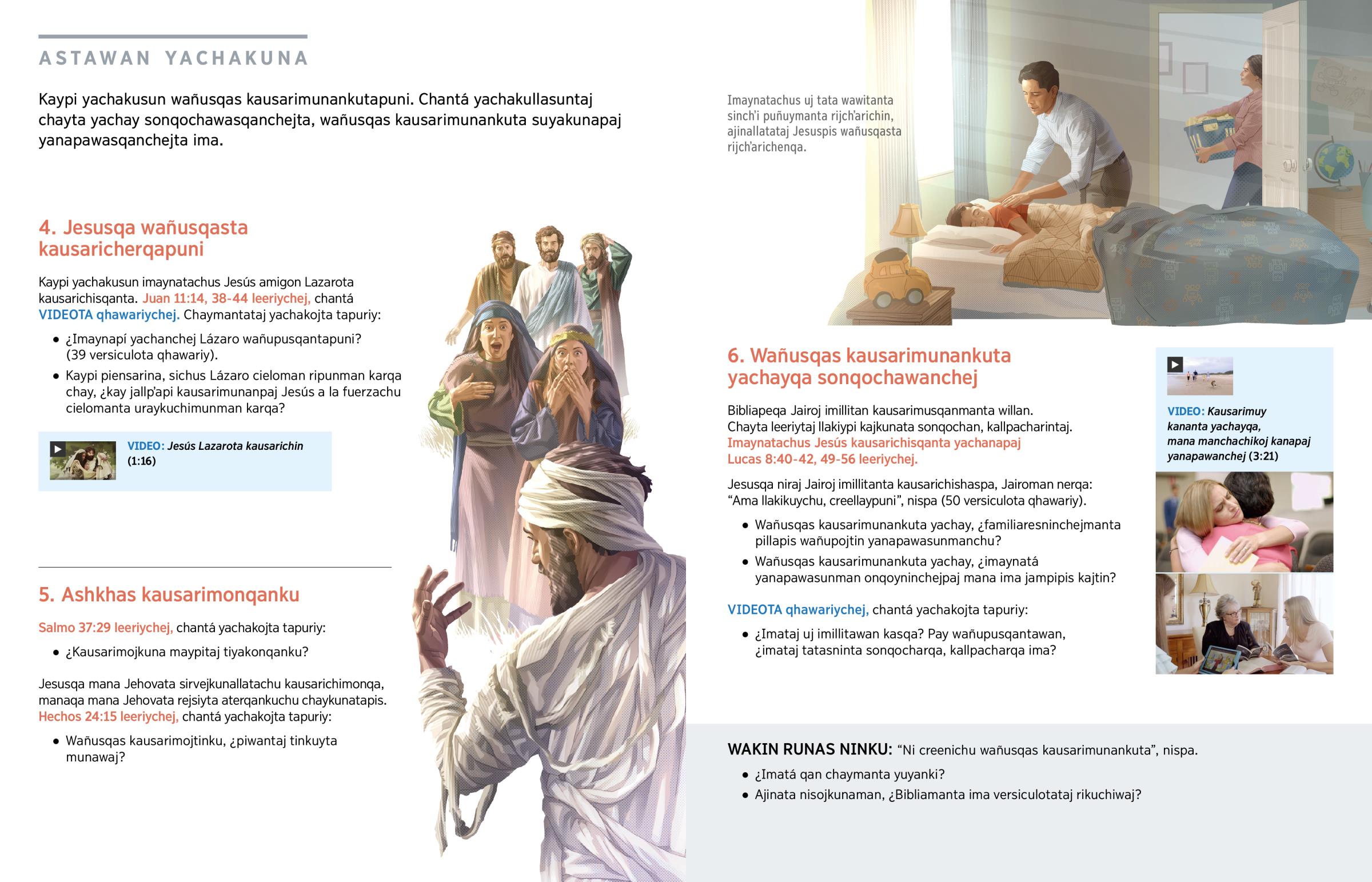 Kaypi yachakusun imaynatachus Jesús amigon Lazarota kausarichisqanta. Juan 11:14, 38-44 leeriychej, chantá VIDEOTA qhawariychej. Chaymantataj yachakojta tapuriy: