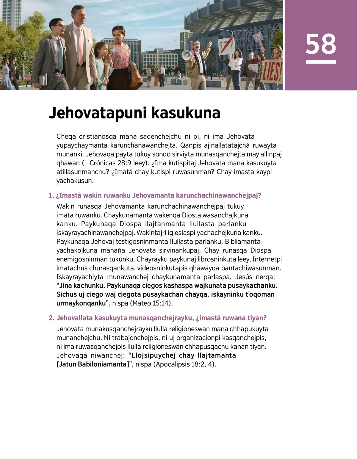 Cheqa cristianosqa mana saqenchejchu ni pi, ni ima Jehovata yupaychaymanta karunchanawanchejta. Qanpis ajinallatatajchá ruwayta munanki. Jehovaqa payta tukuy sonqo sirviyta munasqanchejta may allinpaj qhawan (1 Crónicas 28:9 leey). ¿Ima kutispitaj Jehovata mana kasukuyta atillasunmanchu? ¿Imatá chay kutispi ruwasunman? Chay imasta kaypi yachakusun.