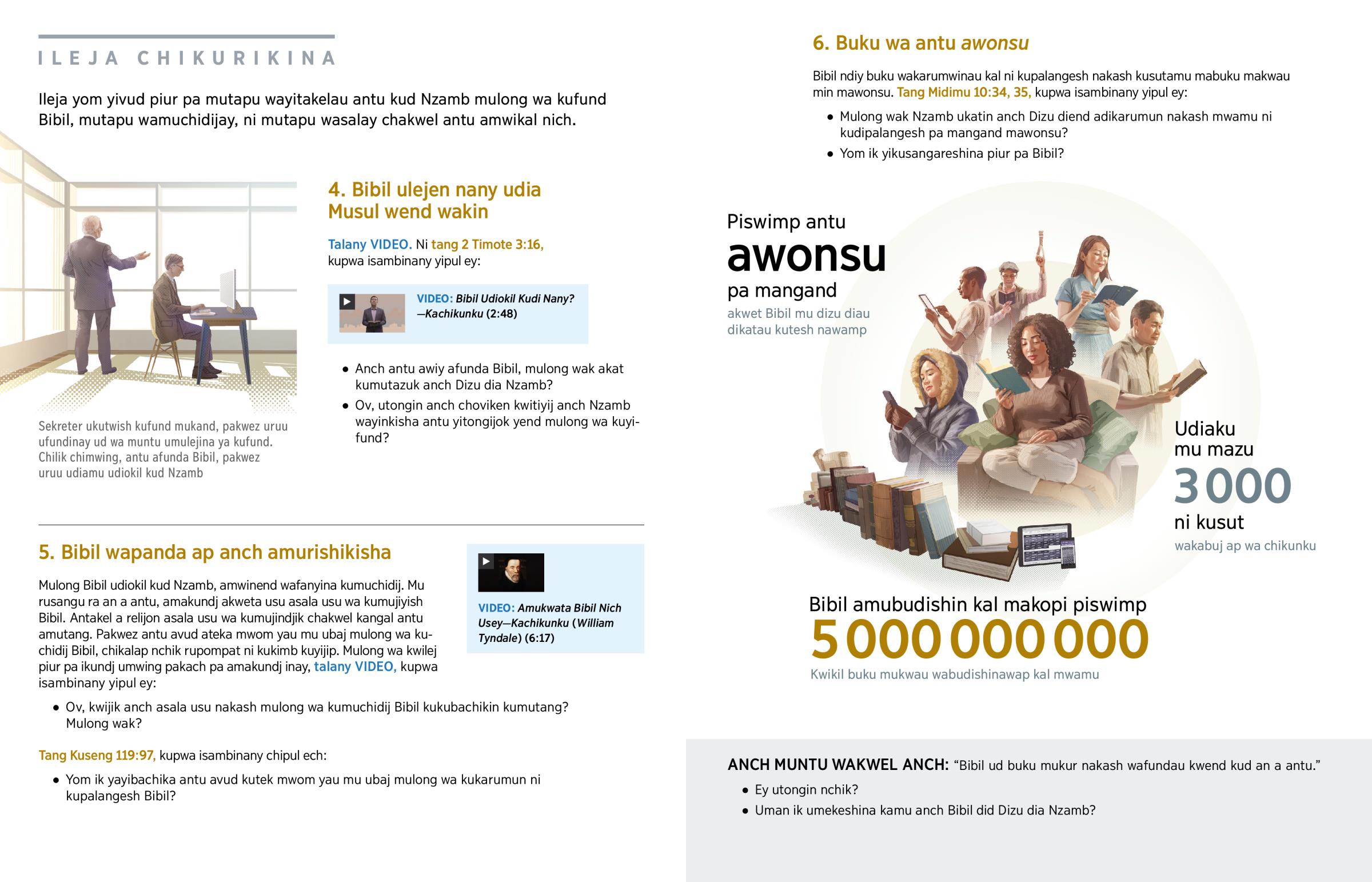 Ileja yom yivud piur pa mutapu wayitakelau antu kud Nzamb mulong wa kufund Bibil, mutapu wamuchidijay, ni mutapu wasalay chakwel antu amwikal nich.