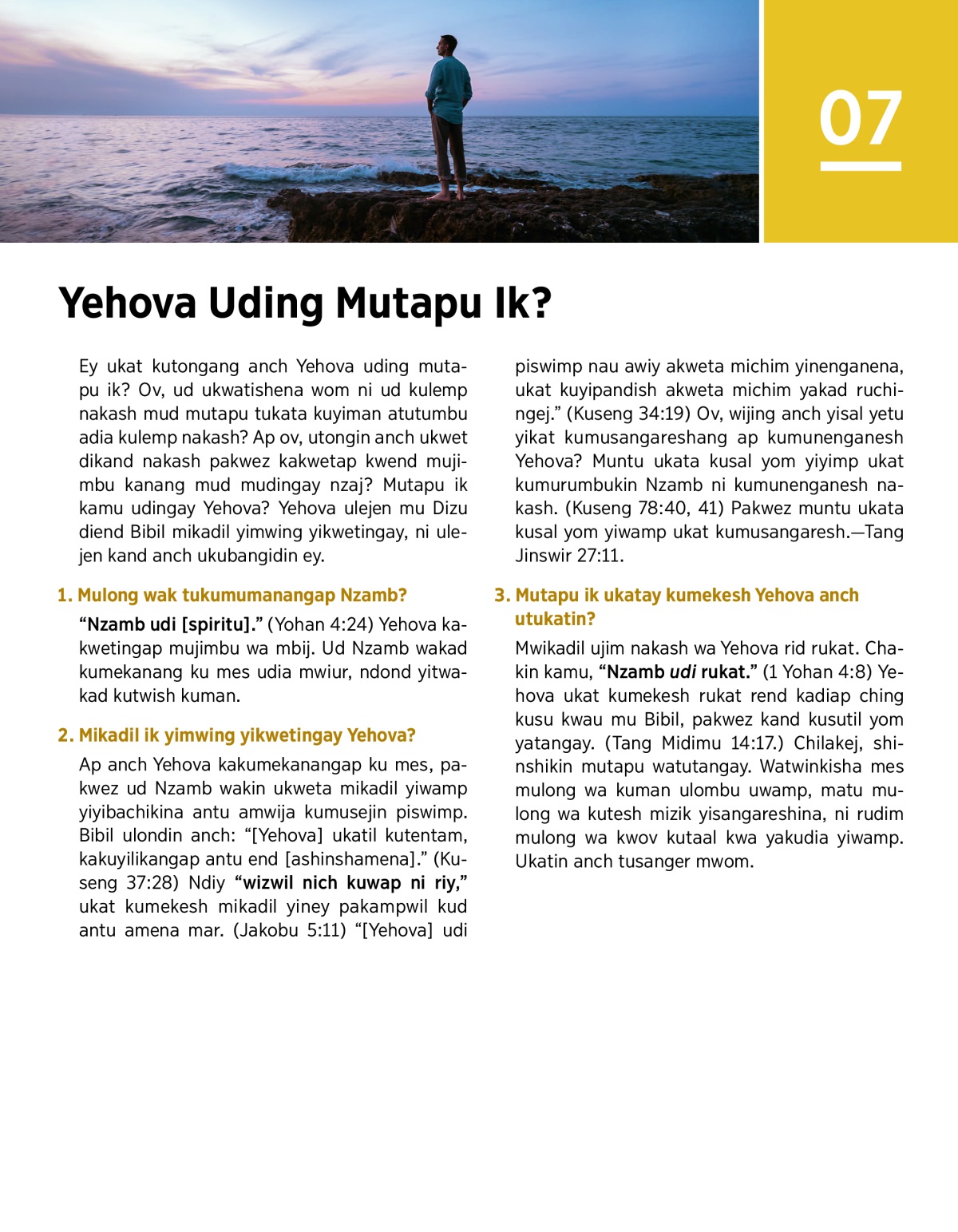 Rusangu riner rikufundishin anch Yehova ukat kwiyovang mutapu ik anch wayiman antu akat kuman mar?—Tal verse wa 7 ni 8.