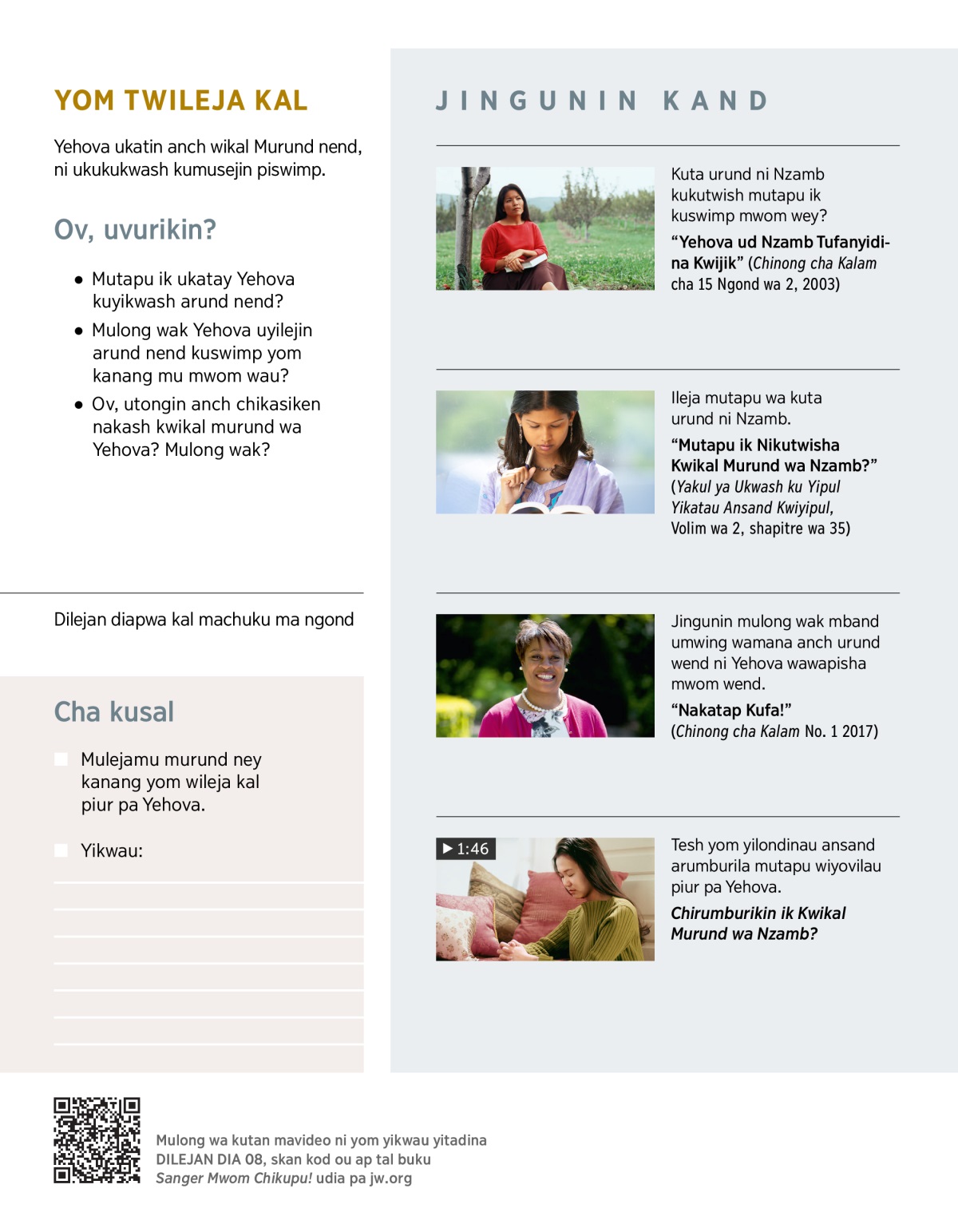 Yehova ukat kuyikwashang arund nend kurish nich milong yikwetau. Talany VIDEO, kupwa isambinany chipul ech: