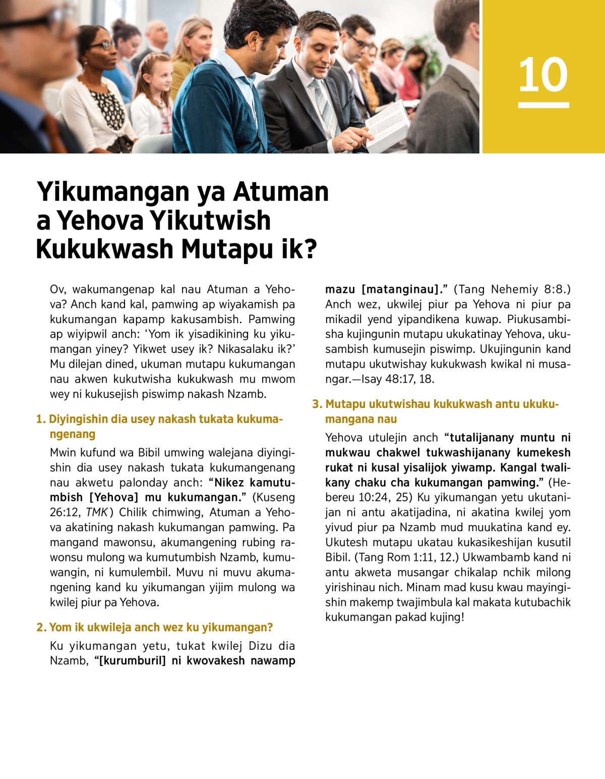 Mwin kufund wa Bibil umwing walejana diyingishin dia usey nakash tukata kukumangenang nau akwetu palonday anch: “Nikez kamutumbish [Yehova] mu kukumangan.” (Kuseng 26:12, TMK) Chilik chimwing, Atuman a Yehova akatining nakash kukumangan pamwing. Pa mangand mawonsu, akumangening rubing rawonsu mulong wa kumutumbish Nzamb, kumuwangin, ni kumulembil. Muvu ni muvu akumangening kand ku yikumangan yijim mulong wa kwilej piur pa Yehova.