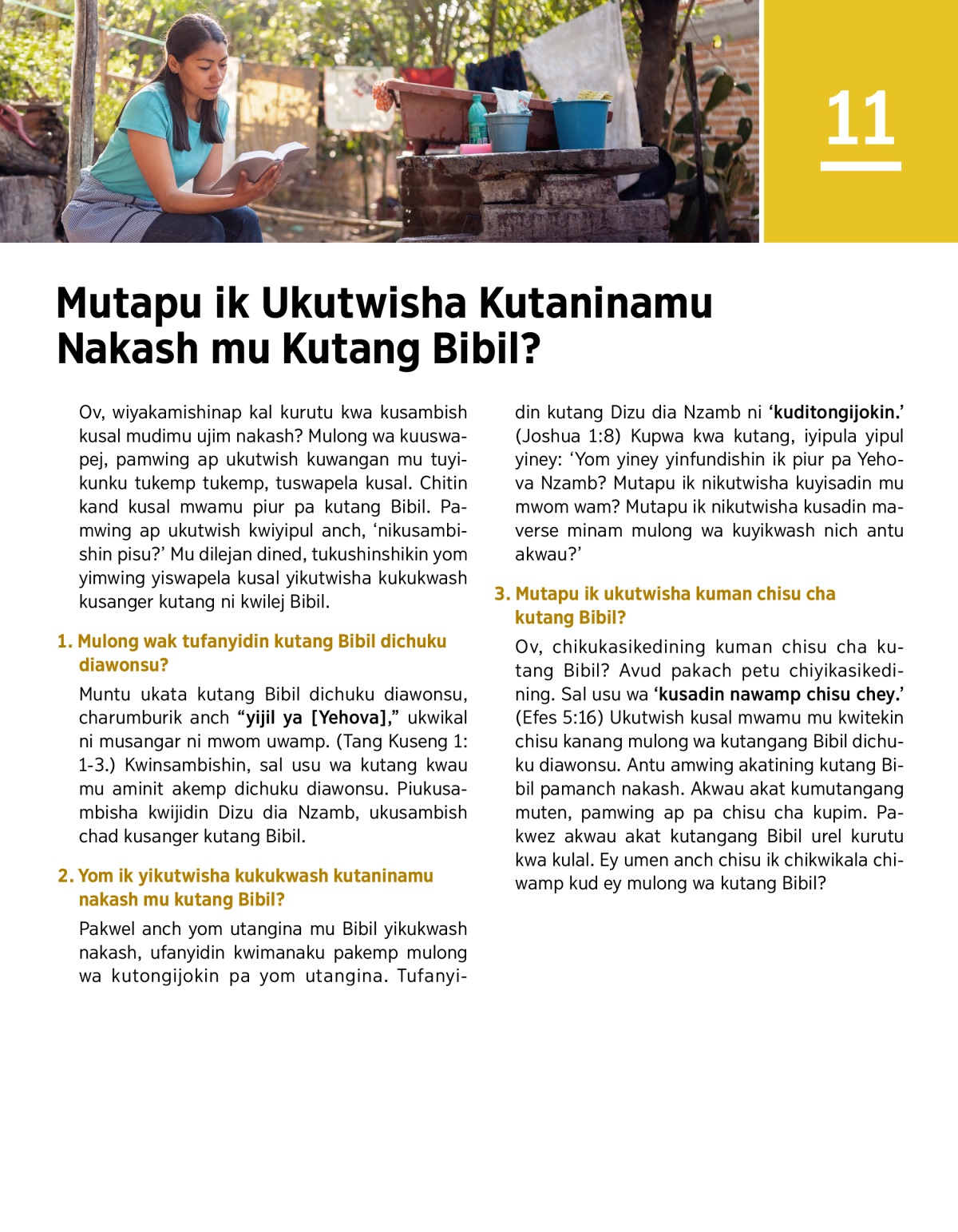 Pakwel anch yom utangina mu Bibil yikukwash nakash, ufanyidin kwimanaku pakemp mulong wa kutongijokin pa yom utangina. Tufanyidin kutang Dizu dia Nzamb ni ‘kuditongijokin.’ (Joshua 1:8) Kupwa kwa kutang, iyipula yipul yiney: ‘Yom yiney yinfundishin ik piur pa Yehova Nzamb? Mutapu ik nikutwisha kuyisadin mu mwom wam? Mutapu ik nikutwisha kusadin maverse minam mulong wa kuyikwash nich antu akwau?’