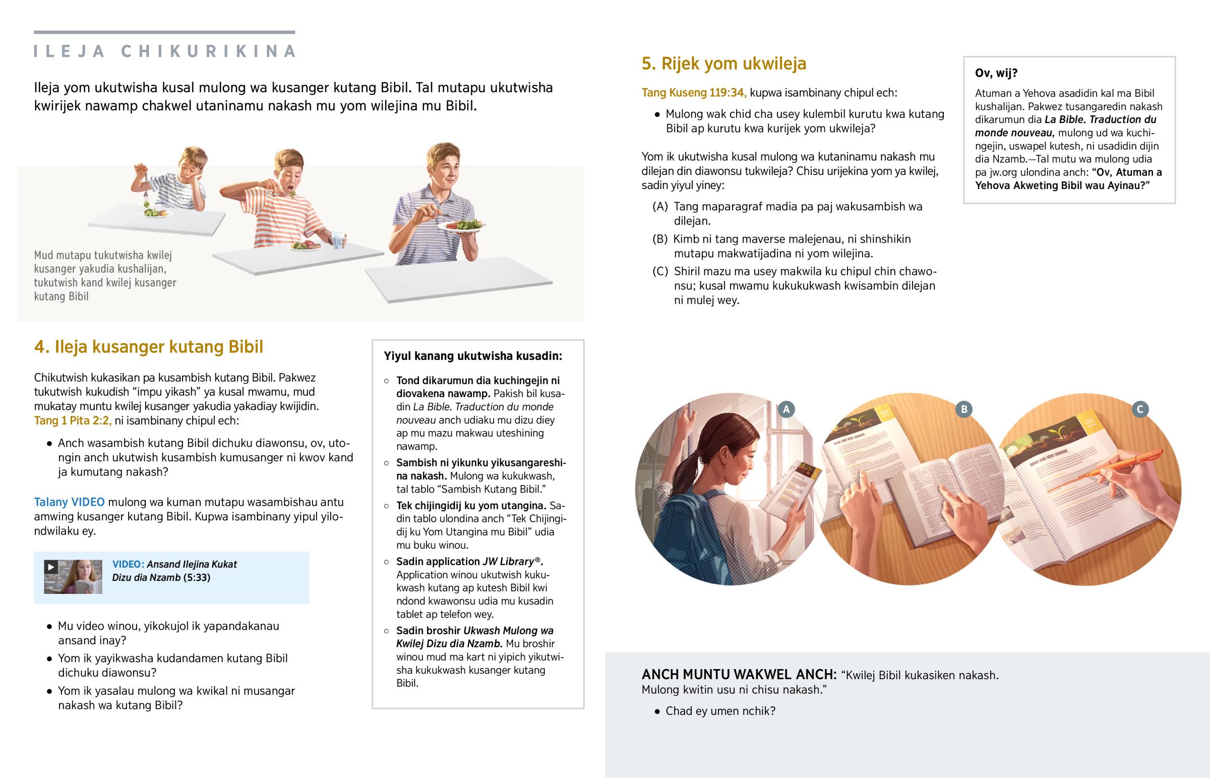 Ov, chikukasikedining kuman chisu cha kutang Bibil? Avud pakach petu chiyikasikedining. Sal usu wa ‘kusadin nawamp chisu chey.’ (Efes 5:16) Ukutwish kusal mwamu mu kwitekin chisu kanang mulong wa kutangang Bibil dichuku diawonsu. Antu amwing akatining kutang Bibil pamanch nakash. Akwau akat kumutangang muten, pamwing ap pa chisu cha kupim. Pakwez akwau akat kutangang Bibil urel kurutu kwa kulal. Ey umen anch chisu ik chikwikala chiwamp kud ey mulong wa kutang Bibil?