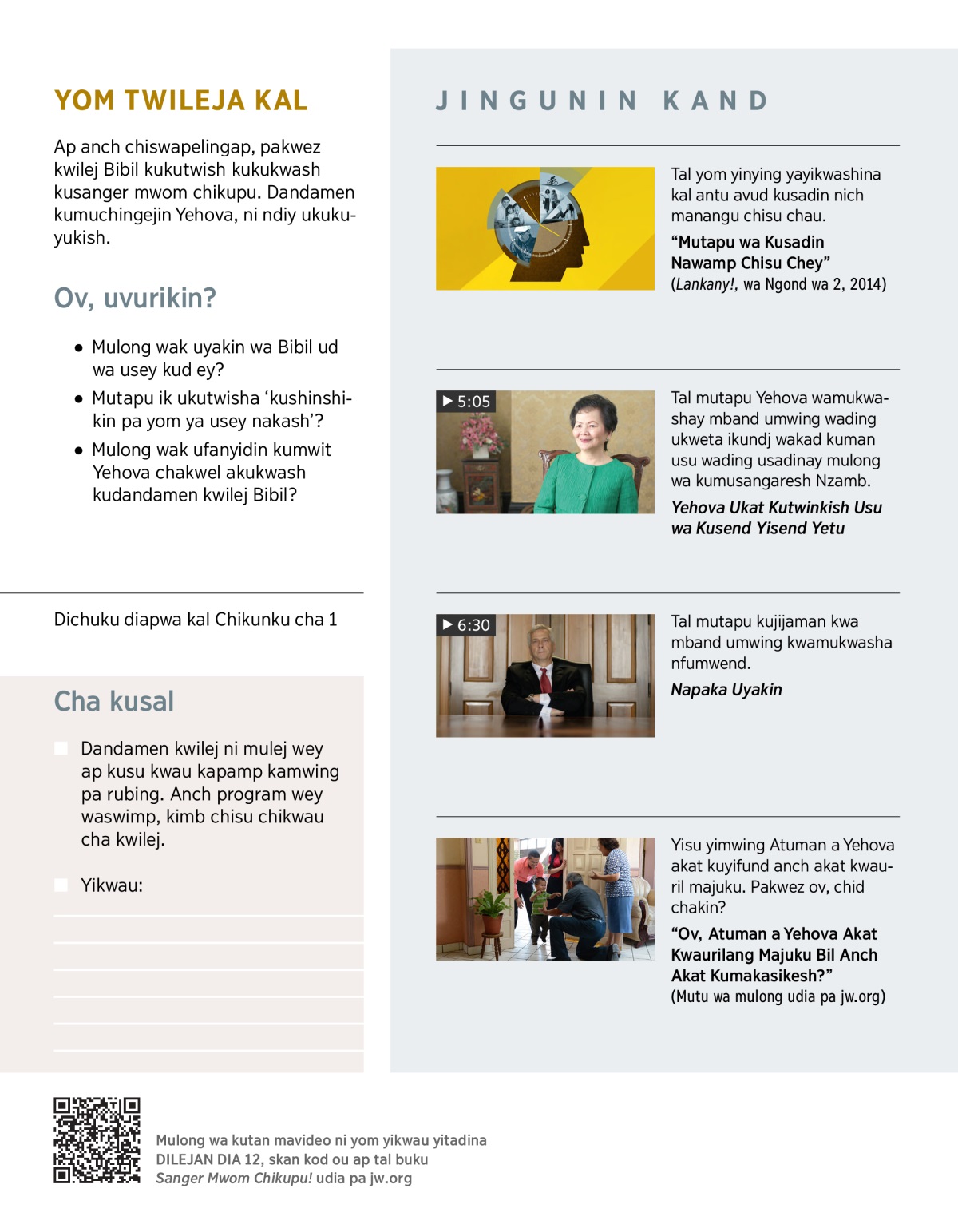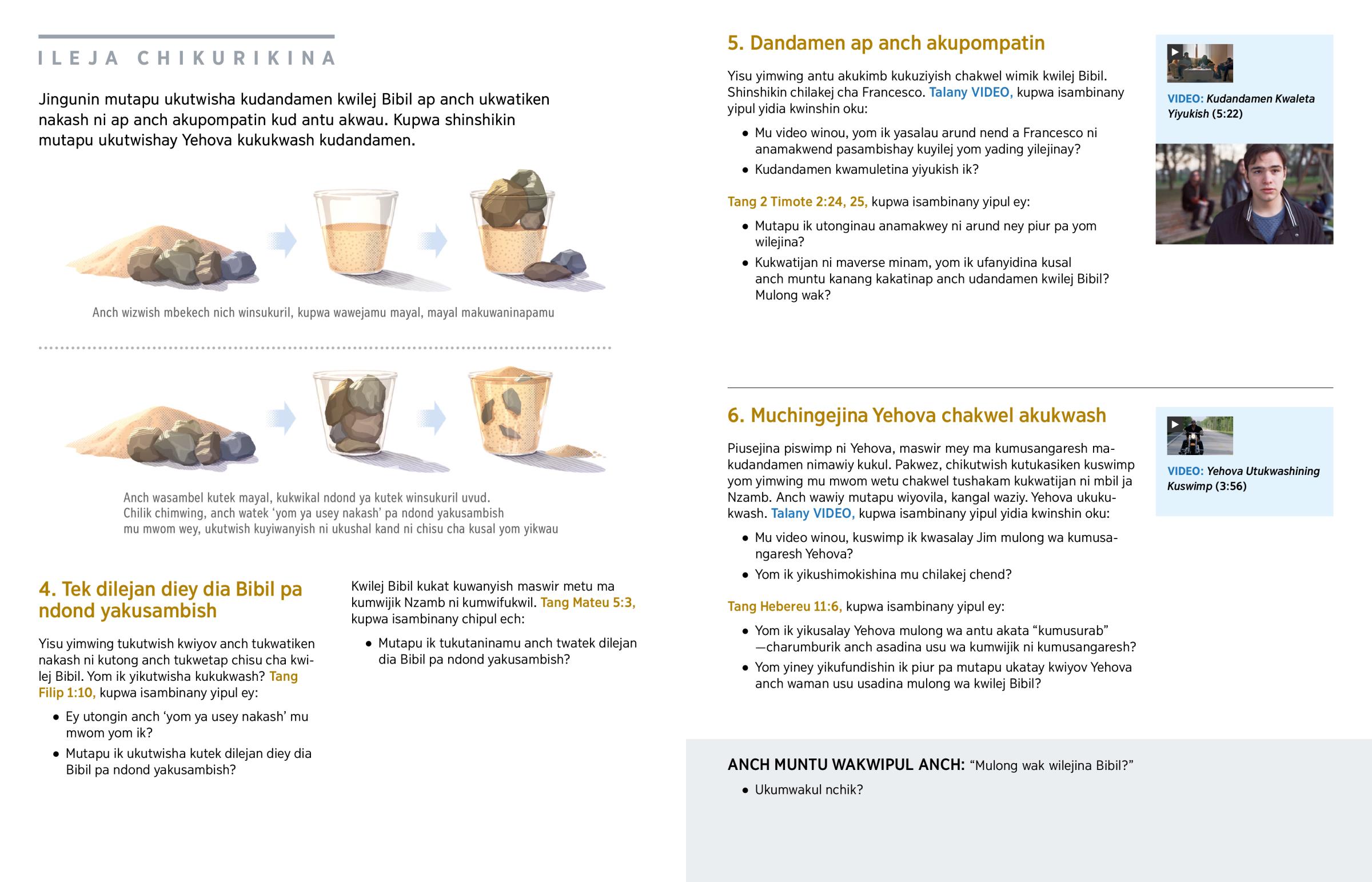 Mulong ud Sakatang mwin dikand diawonsu ni Murund ney, Yehova ukatin kukukwash chakwel wileja piur pend. Ukutwish kukwinkish ‘impu ni usu wa kusal yom.’ (Tang Filip 2:13.) Chawiy, anch yisu yimwing ukwet kand kuswir kwa usu mulong wa kwilej ap mulong wa kusadin yom wilejina, ukutwish kukukwash. Anch ukwet kand kuswir kwa usu mulong wa kupandikan yikangesh ap rupompat, ndiy ukutwish kukwinkish. Mulembila Yehova chisu chawonsu chakwel akukwasha kudandamen kwilej Bibil.—1 Tesalonik 5:17.