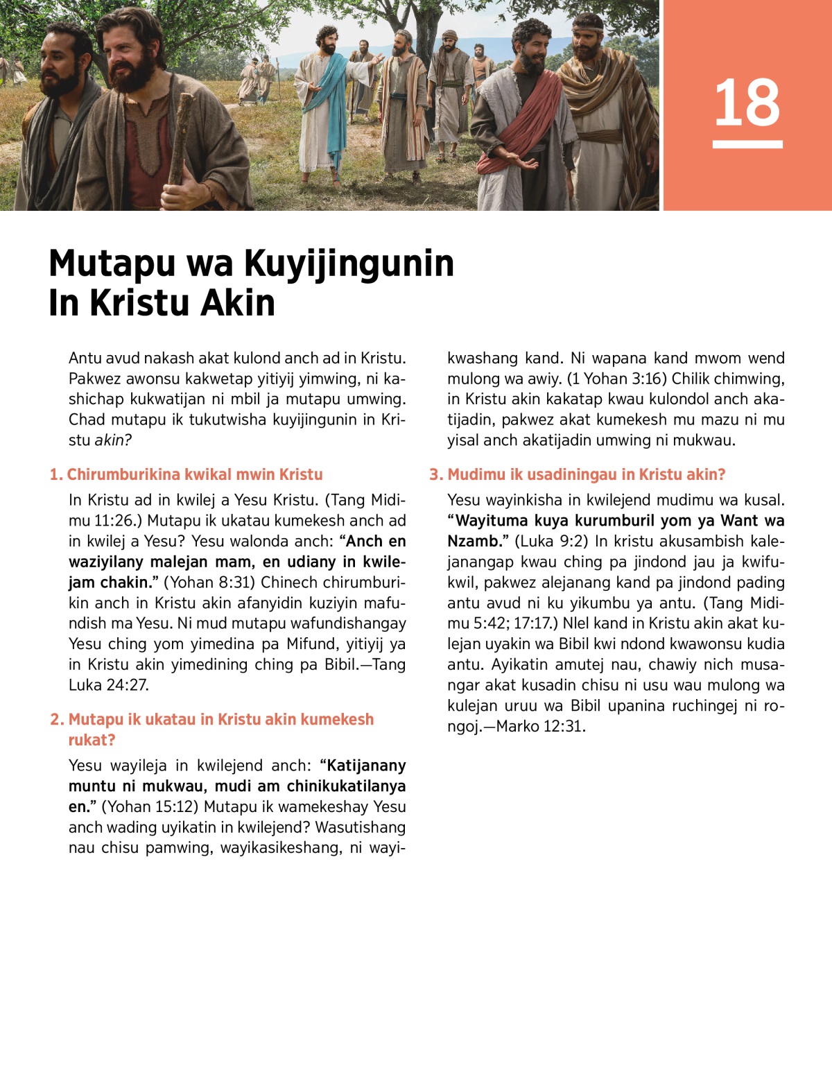 In Kristu ad in kwilej a Yesu Kristu. (Tang Midimu 11:26.) Mutapu ik ukatau kumekesh anch ad in kwilej a Yesu? Yesu walonda anch: “Anch en waziyilany malejan mam, en udiany in kwilejam chakin.” (Yohan 8:31) Chinech chirumburikin anch in Kristu akin afanyidin kuziyin mafundish ma Yesu. Ni mud mutapu wafundishangay Yesu ching yom yimedina pa Mifund, yitiyij ya in Kristu akin yimedining ching pa Bibil.—Tang Luka 24:27.