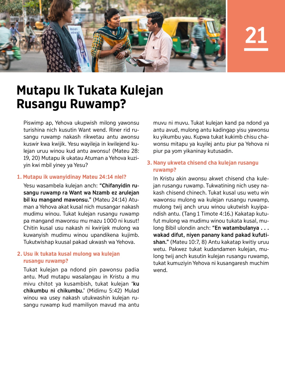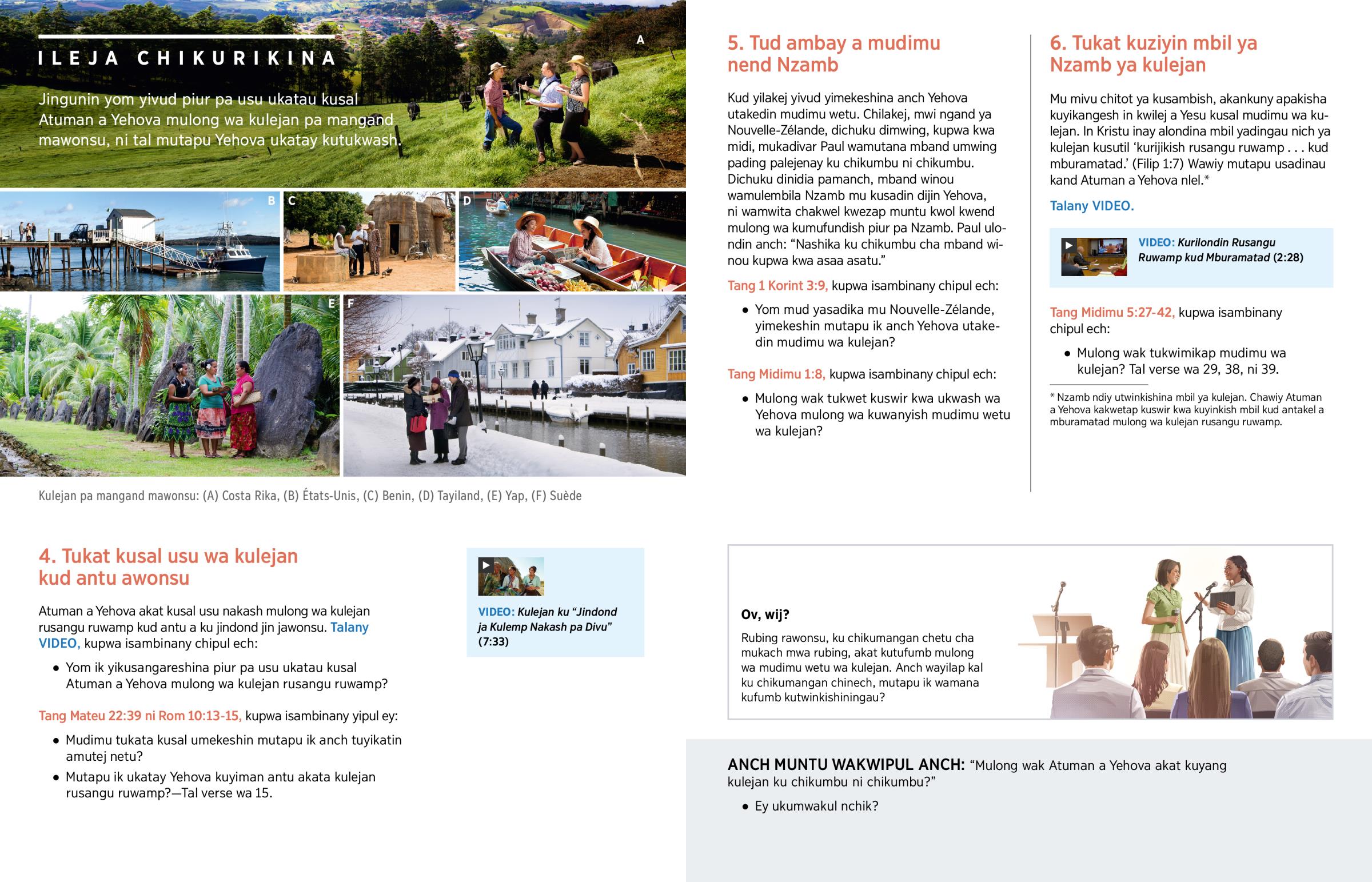 Tukat kulejan pa ndond pin pawonsu padia antu. Mud mutapu wasalangau in Kristu a mu mivu chitot ya kusambish, tukat kulejan ‘ku chikumbu ni chikumbu.’ (Midimu 5:42) Mulad winou wa usey nakash utukwashin kulejan rusangu ruwamp kud mamiliyon mavud ma antu muvu ni muvu. Tukat kulejan kand pa ndond ya antu avud, mulong antu kadingap yisu yawonsu ku yikumbu yau. Kupwa tukat kukimb chisu chawonsu mitapu ya kuyilej antu piur pa Yehova ni piur pa yom yikaninay kutusadin.