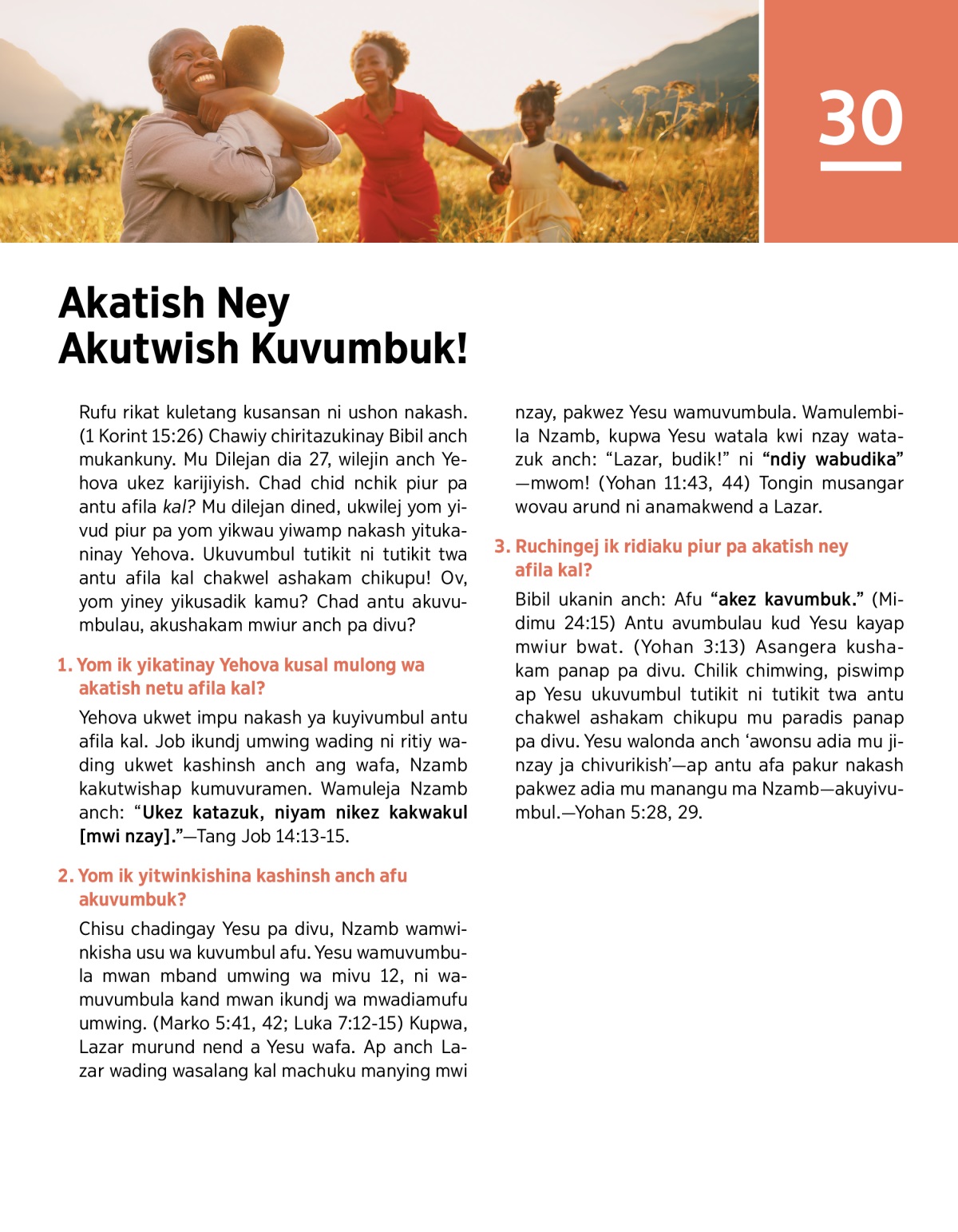 Bibil ukanin anch: Afu “akez kavumbuk.” (Midimu 24:15) Antu avumbulau kud Yesu kayap mwiur bwat. (Yohan 3:13) Asangera kushakam panap pa divu. Chilik chimwing, piswimp ap Yesu ukuvumbul tutikit ni tutikit twa antu chakwel ashakam chikupu mu paradis panap pa divu. Yesu walonda anch ‘awonsu adia mu jinzay ja chivurikish’—ap antu afa pakur nakash pakwez adia mu manangu ma Nzamb—akuyivumbul.—Yohan 5:28, 29.
