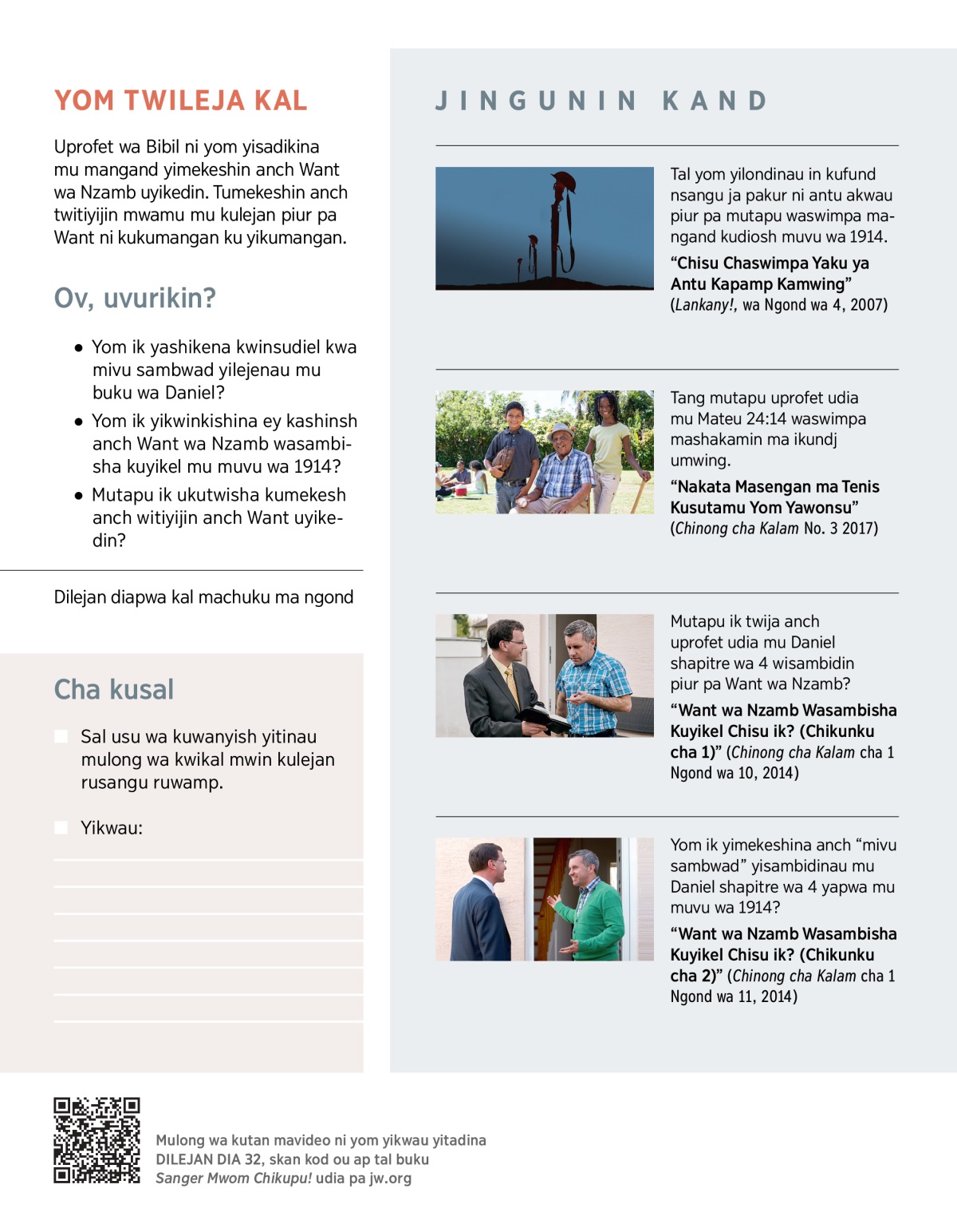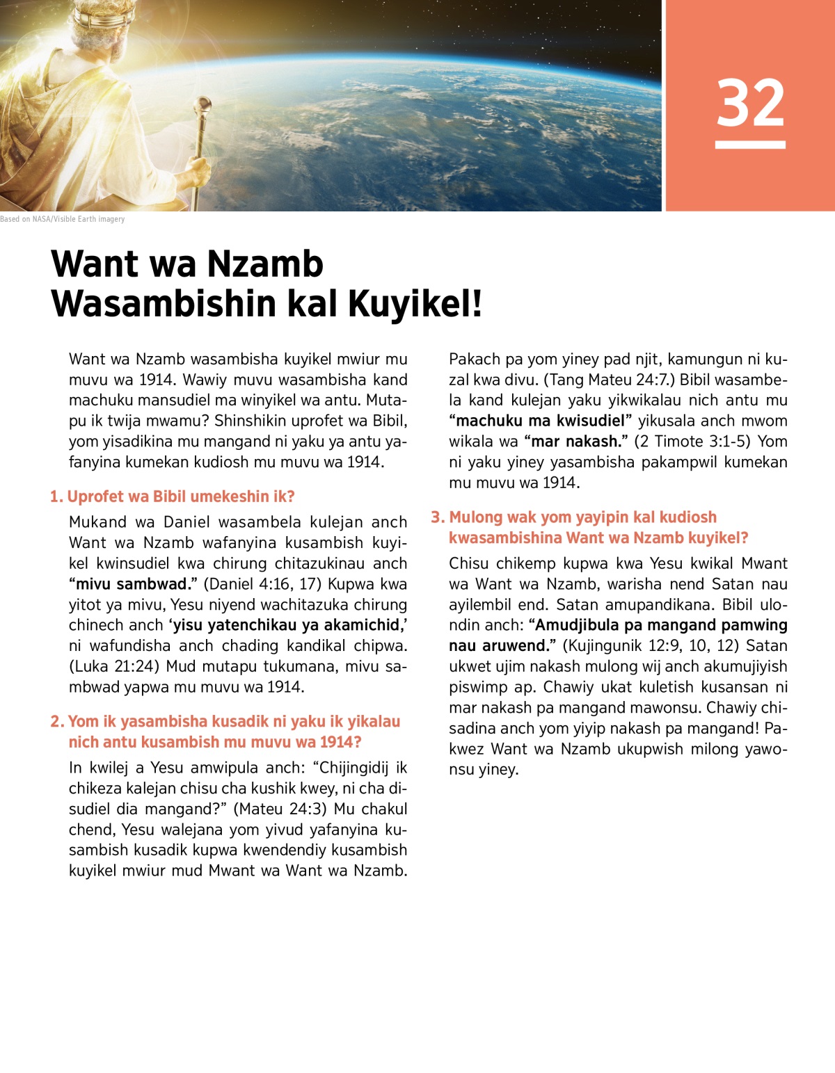 Want wa Nzamb wasambisha kuyikel mwiur mu muvu wa 1914. Wawiy muvu wasambisha kand machuku mansudiel ma winyikel wa antu. Mutapu ik twija mwamu? Shinshikin uprofet wa Bibil, yom yisadikina mu mangand ni yaku ya antu yafanyina kumekan kudiosh mu muvu wa 1914.