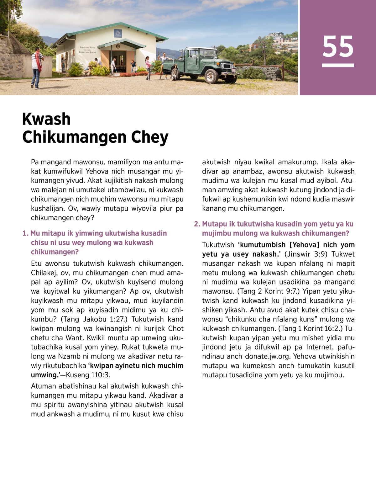 Etu awonsu tukutwish kukwash chikumangen. Chilakej, ov, mu chikumangen chen mud amapal ap ayilim? Ov, ukutwish kuyisend mulong wa kuyitwal ku yikumangan? Ap ov, ukutwish kuyikwash mu mitapu yikwau, mud kuyilandin yom mu sok ap kuyisadin midimu ya ku chikumbu? (Tang Jakobu 1:27.) Tukutwish kand kwipan mulong wa kwinangish ni kurijek Chot chetu cha Want. Kwikil muntu ap umwing ukutubachika kusal yom yiney. Rukat tukweta mulong wa Nzamb ni mulong wa akadivar netu rawiy rikutubachika ‘kwipan ayinetu nich muchim umwing.’—Kuseng 110:3.