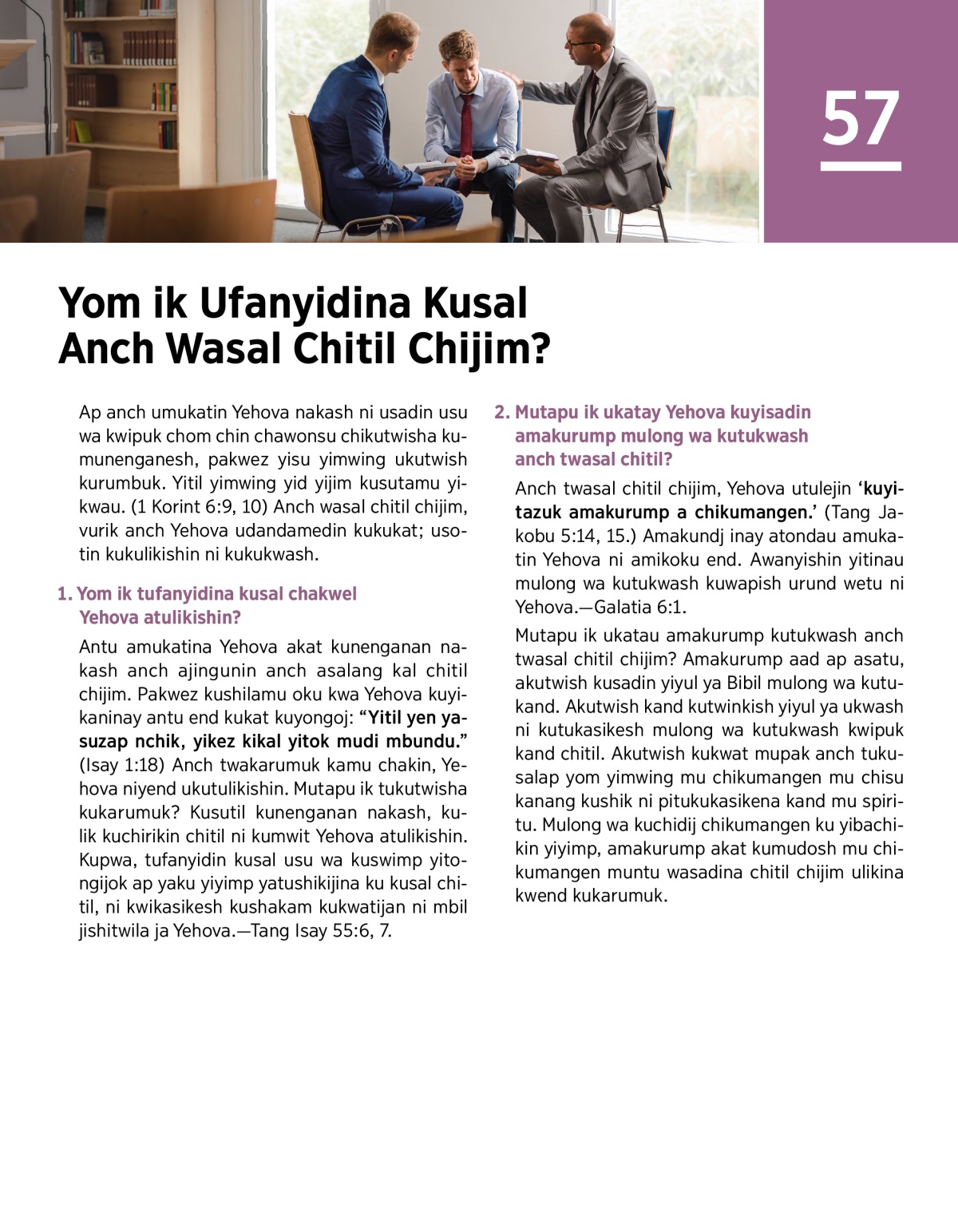 Ap anch umukatin Yehova nakash ni usadin usu wa kwipuk chom chin chawonsu chikutwisha kumunenganesh, pakwez yisu yimwing ukutwish kurumbuk. Yitil yimwing yid yijim kusutamu yikwau. (1 Korint 6:9, 10) Anch wasal chitil chijim, vurik anch Yehova udandamedin kukukat; usotin kukulikishin ni kukukwash.