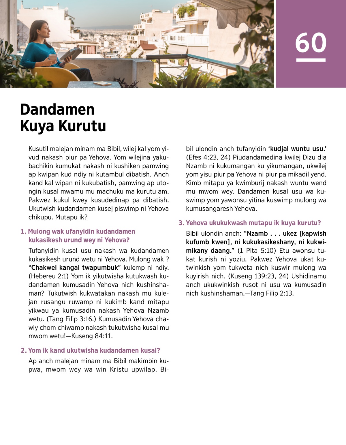 Ap anch malejan minam ma Bibil makimbin kupwa, mwom wey wa win Kristu upwilap. Bibil ulondin anch tufanyidin ‘kudjal wuntu usu.’ (Efes 4:23, 24) Piudandamedina kwilej Dizu dia Nzamb ni kukumangan ku yikumangan, ukwilej yom yisu piur pa Yehova ni piur pa mikadil yend. Kimb mitapu ya kwimburij nakash wuntu wend mu mwom wey. Dandamen kusal usu wa kuswimp yom yawonsu yitina kuswimp mulong wa kumusangaresh Yehova.