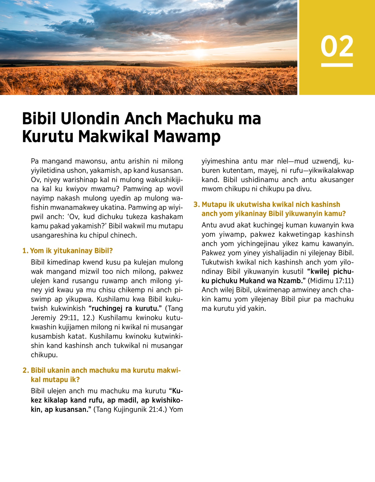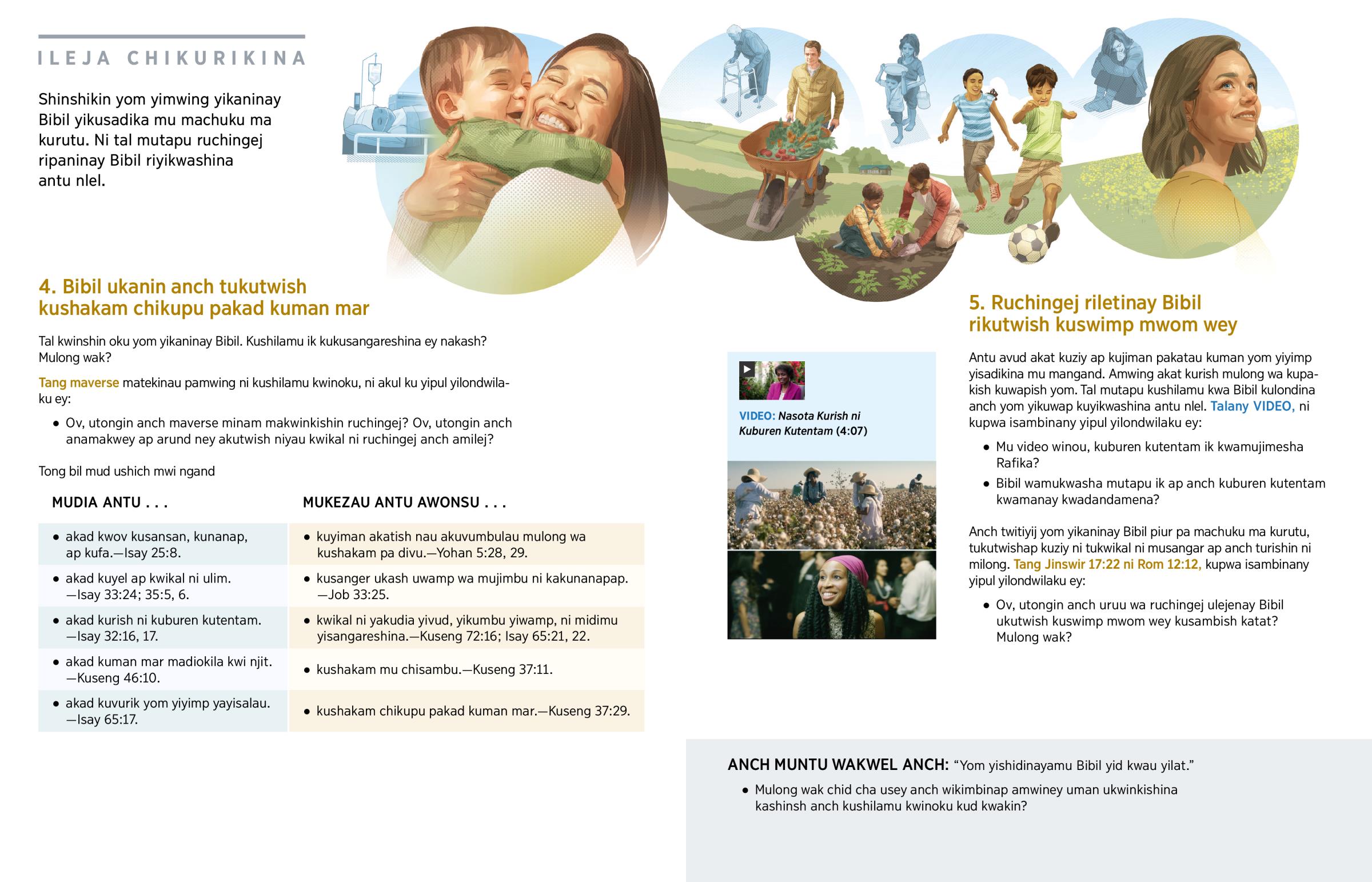 Bibil kimedinap kwend kusu pa kulejan mulong wak mangand mizwil too nich milong, pakwez ulejen kand rusangu ruwamp anch milong yiney yid kwau ya mu chisu chikemp ni anch piswimp ap yikupwa. Kushilamu kwa Bibil kukutwish kukwinkish “ruchingej ra kurutu.” (Tang Jeremiy 29:11, 12.) Kushilamu kwinoku kutukwashin kujijamen milong ni kwikal ni musangar kusambish katat. Kushilamu kwinoku kutwinkishin kand kashinsh anch tukwikal ni musangar chikupu.