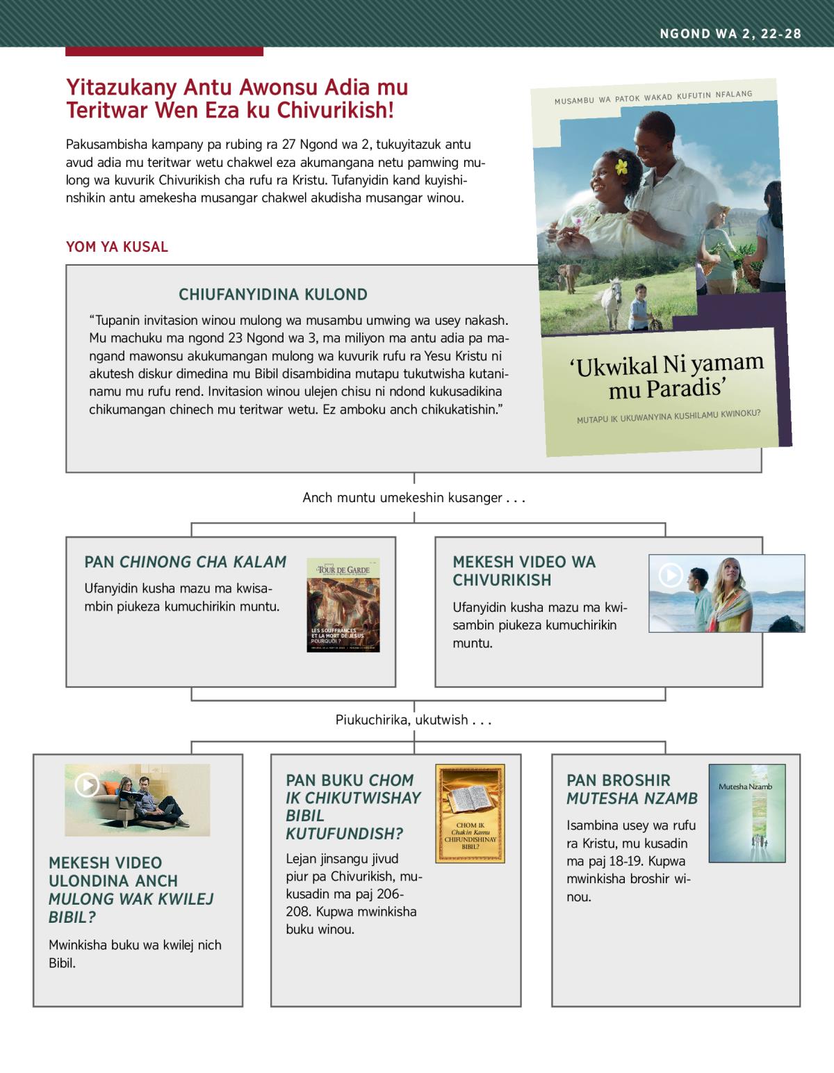 “Tupanin invitasion winou mulong wa musambu umwing wa usey nakash. Mu machuku ma ngond 23 Ngond wa 3, ma miliyon ma antu adia pa mangand mawonsu akukumangan mulong wa kuvurik rufu ra Yesu Kristu ni akutesh diskur dimedina mu Bibil disambidina mutapu tukutwisha kutaninamu mu rufu rend. Invitasion winou ulejen chisu ni ndond kukusadikina chikumangan chinech mu teritwar wetu. Ez amboku anch chikukatishin.”