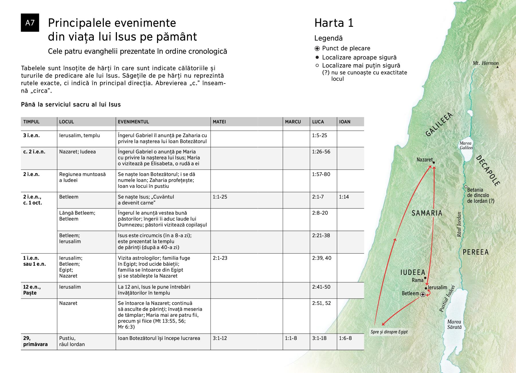 Tabelele sunt însoțite de hărți în care sunt indicate călătoriile și tururile de predicare ale lui Isus. Săgețile de pe hărți nu reprezintă rutele exacte, ci indică în principal direcția. Abrevierea „c.” înseamnă „circa”.